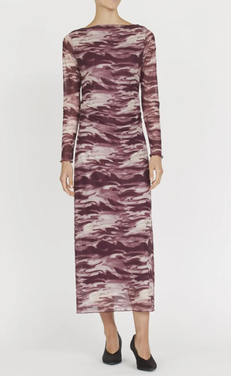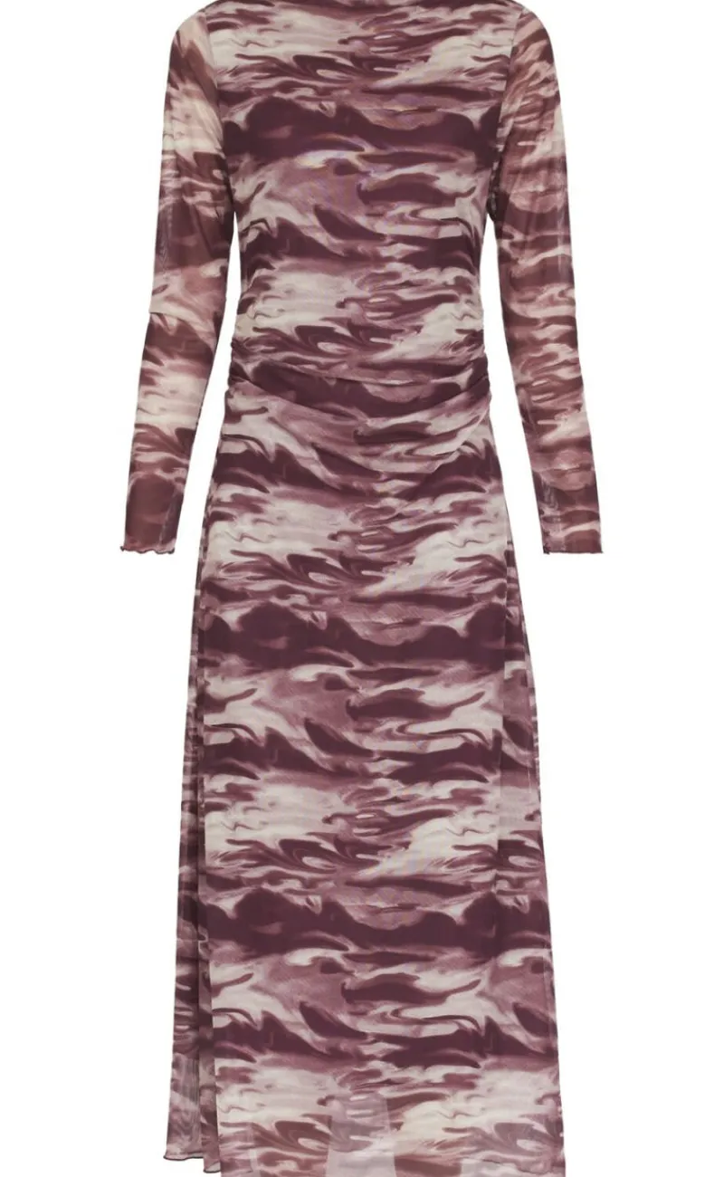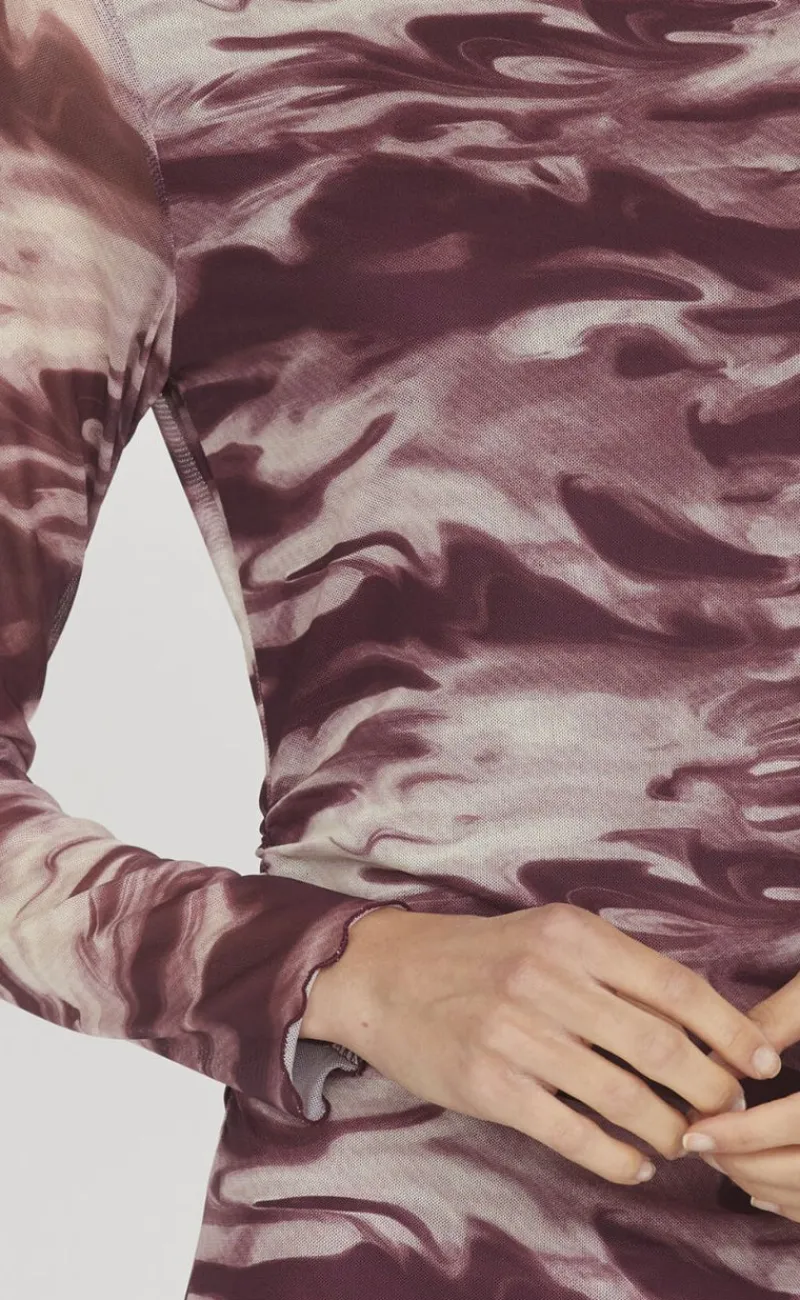 love1198 er en langærmet mesh kjole med rund hals og rosa/hvid camouflage. lettuce-kant finish.