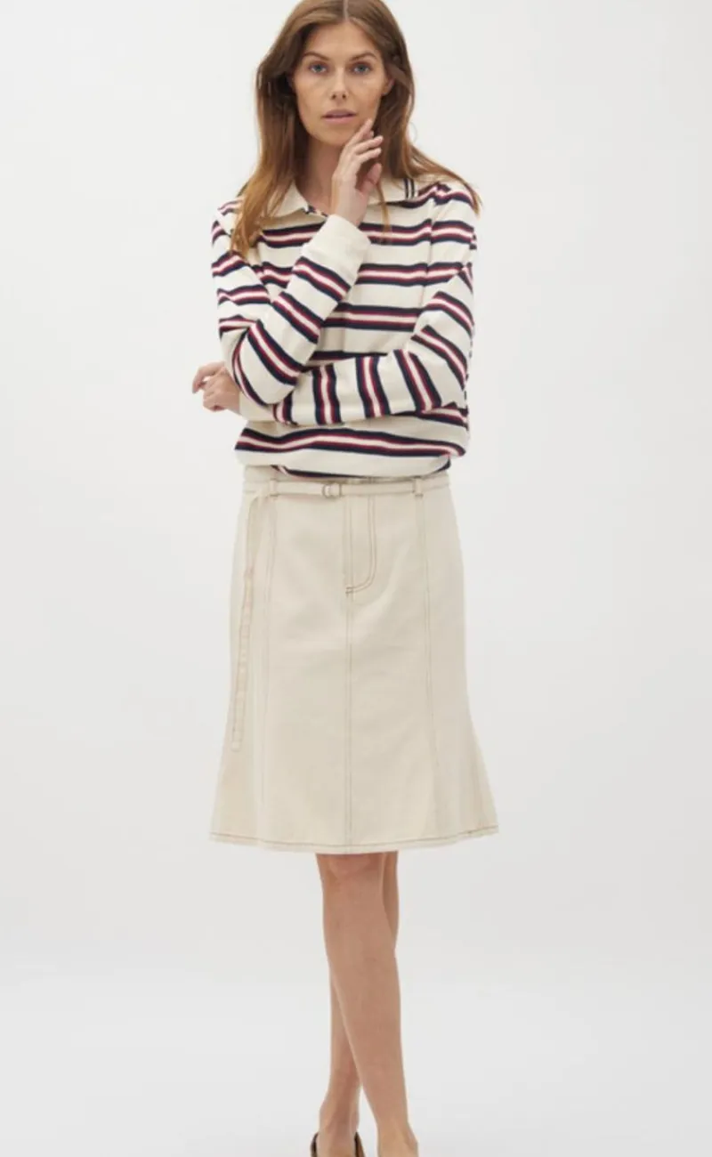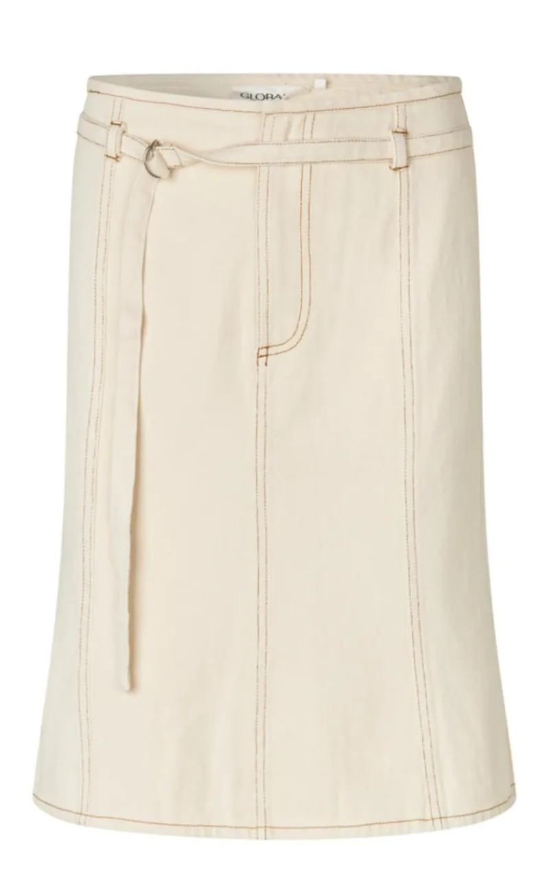 Denne nederdel går til knæet, og har bindebånd i taljen.