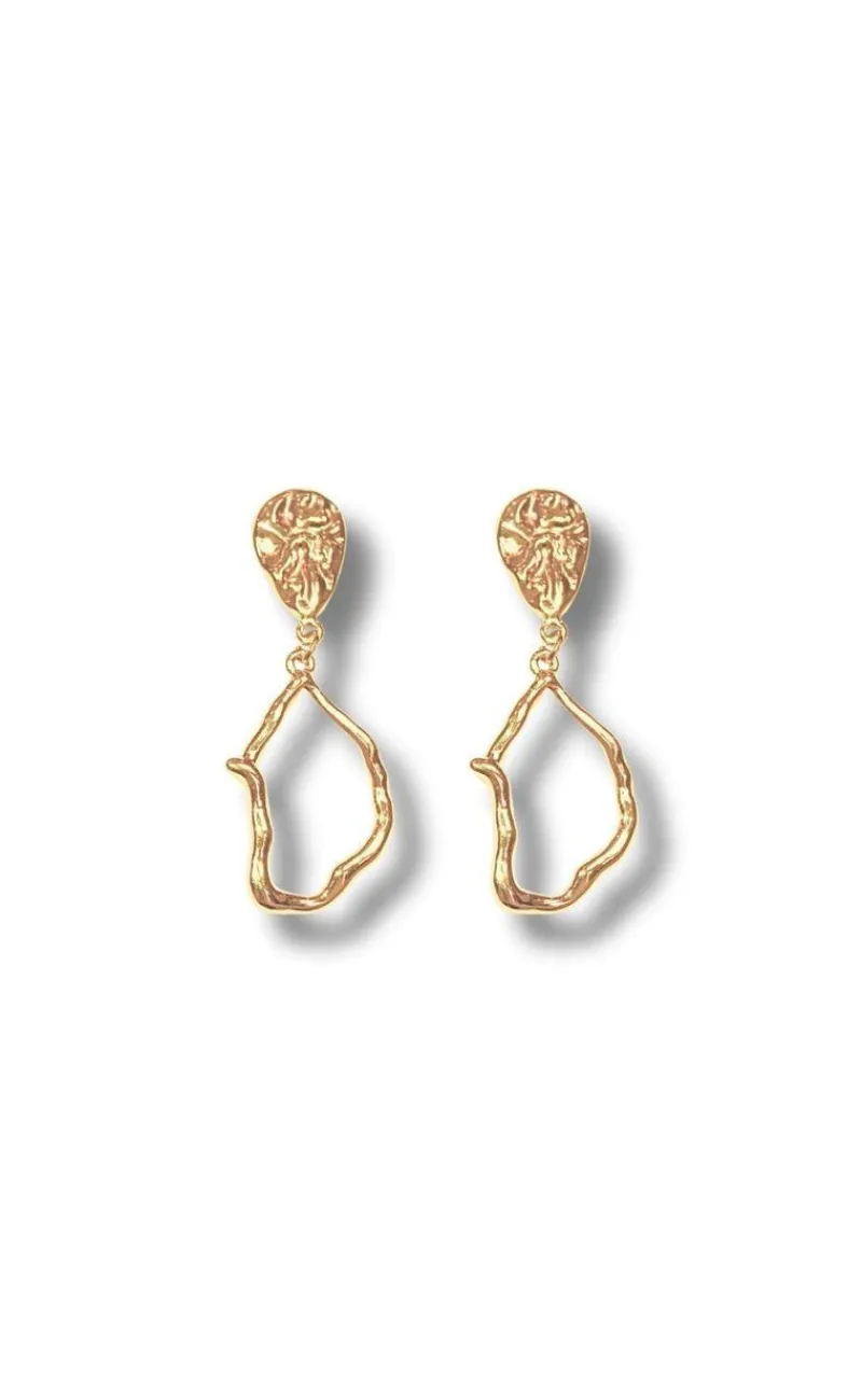 Smukke øreringe fra Smykkeli Copenhagen, der hænger ned fra øret. Øreringene er guld og har en hamret overflade, som skaber et eksklusivt udtryk.