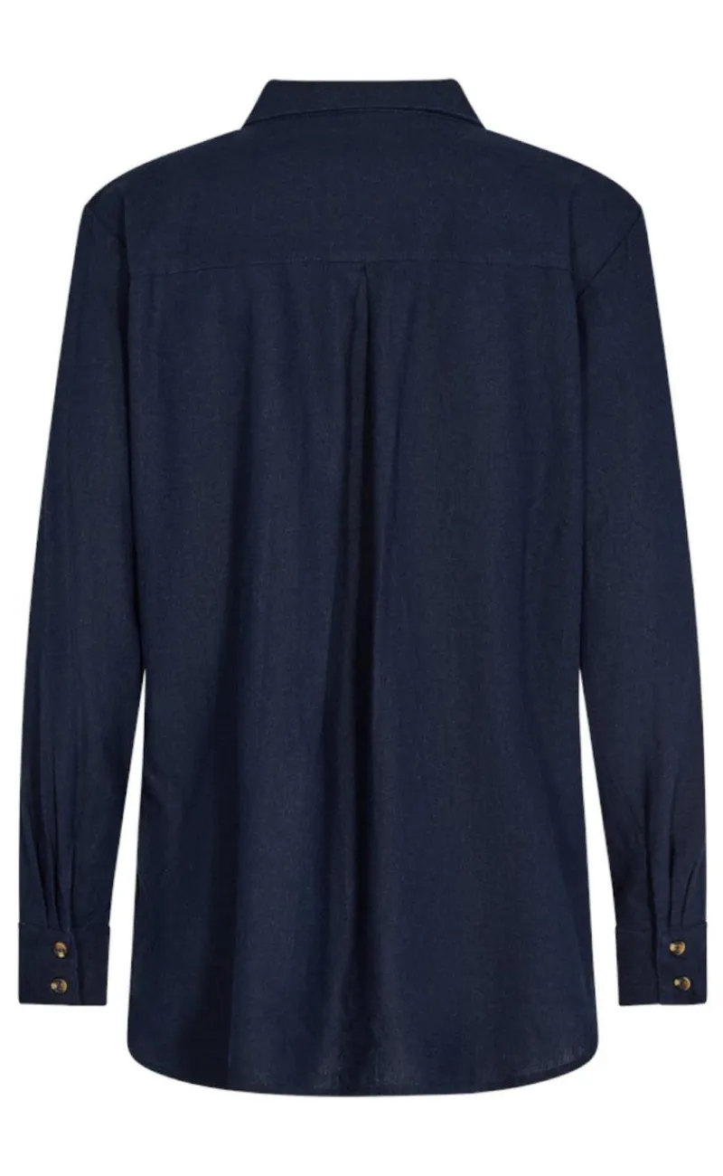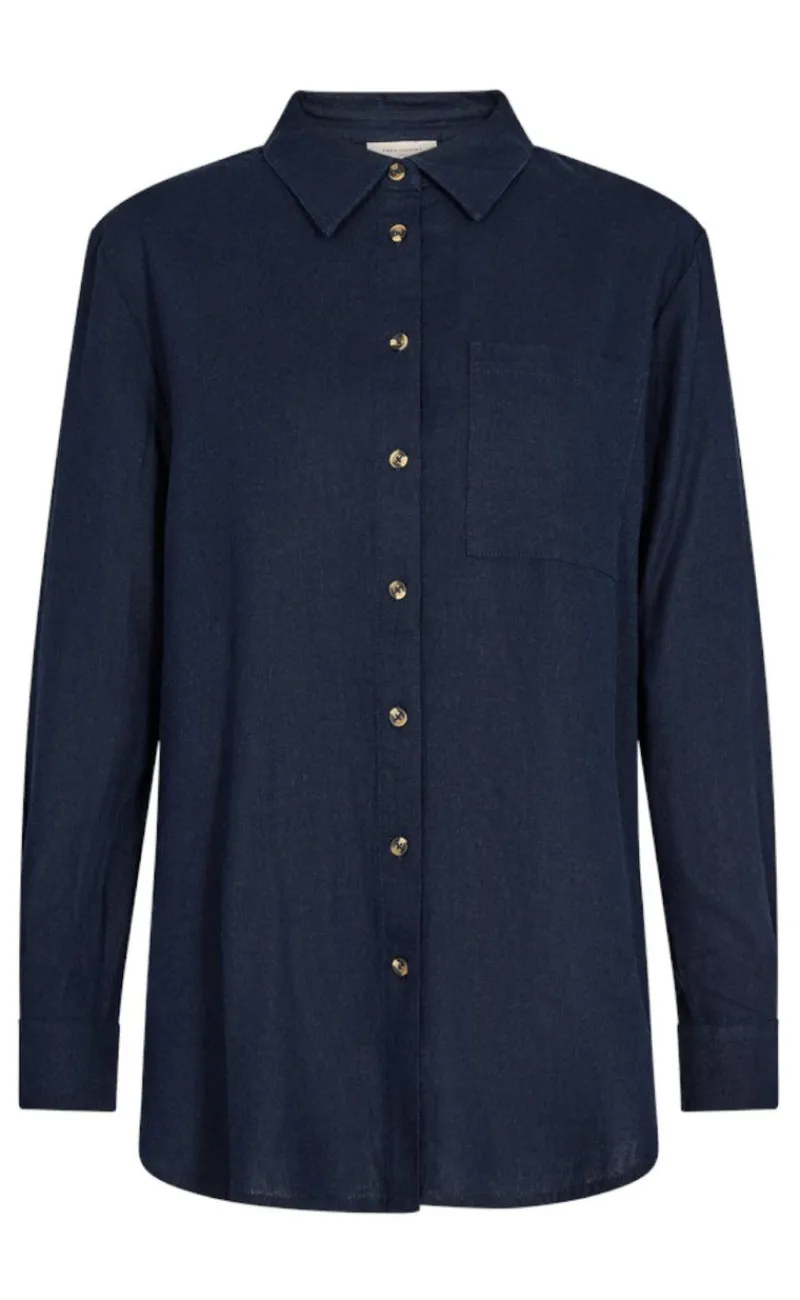 Skjorten har lange ærmer, er gennemknappet, en klassisk skjortekrave samt én brystlomme.