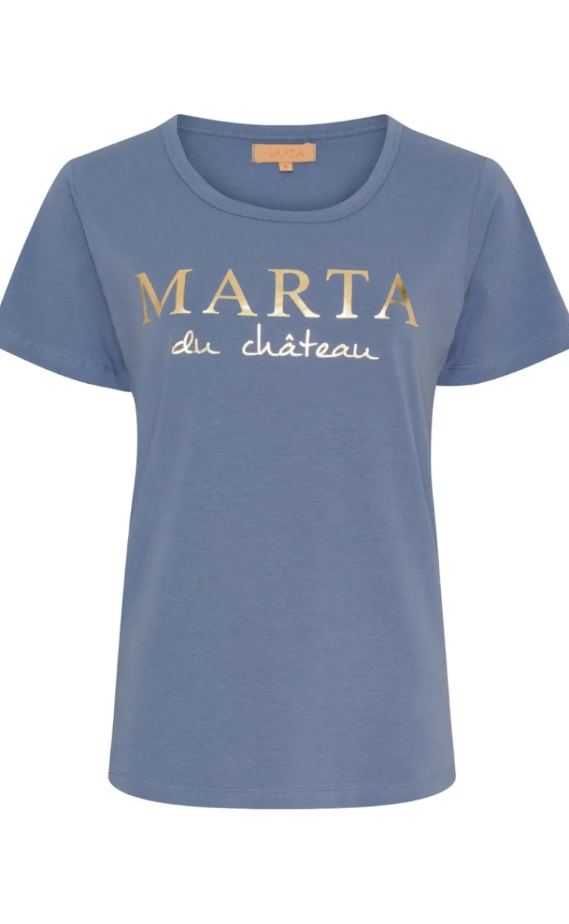 Sød t-shirt fra Marta Du Chateau i denim blå, med guld skrift på brystet.