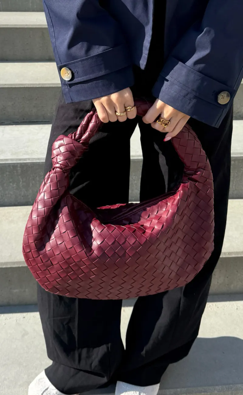 Tasken kan bæres over skulderen og åbnes med en lynlås.