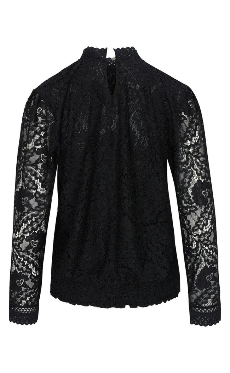 Blusen har blonde ærmer, høj blonde-hals og mange andre fine detaljer.