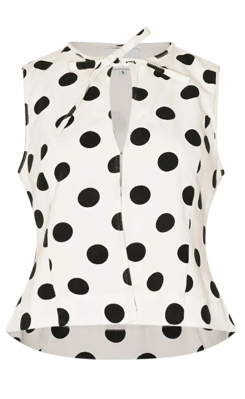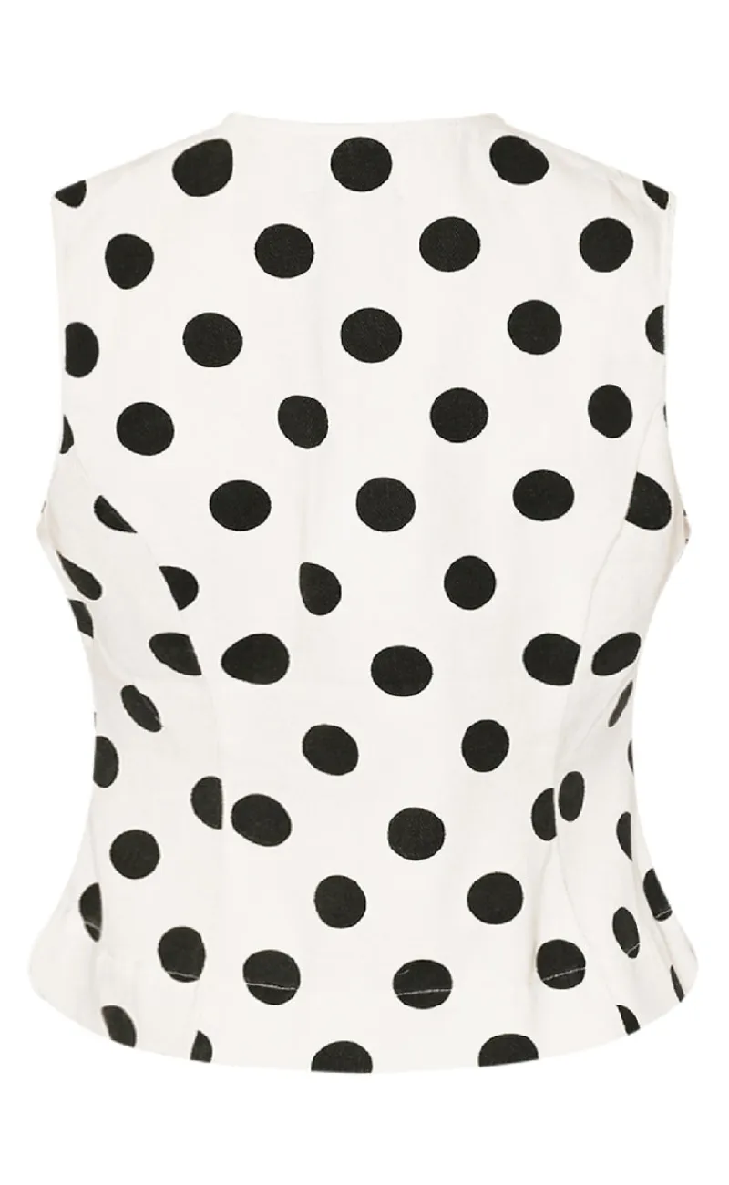 Blusen er hvid med sorte prikker.