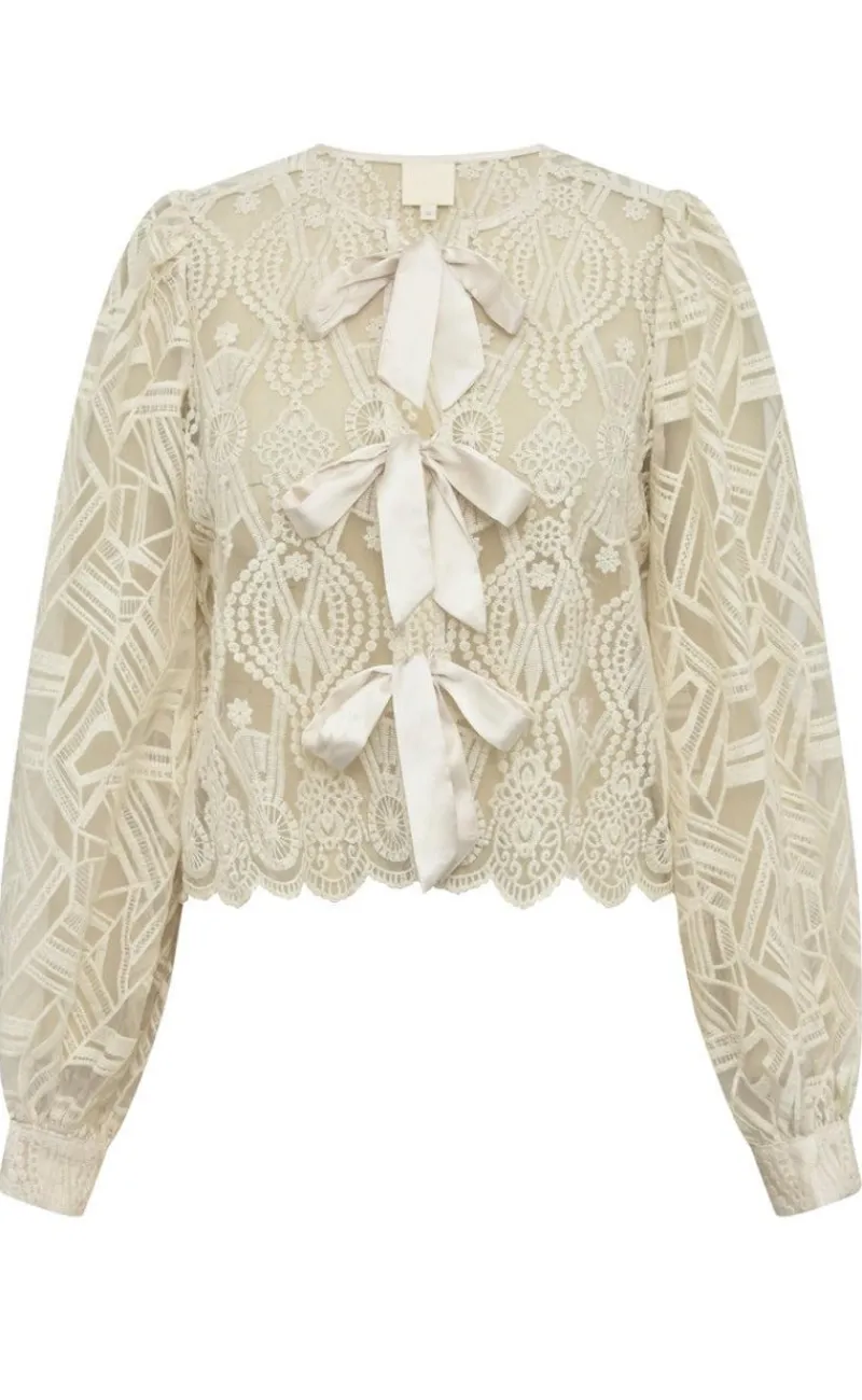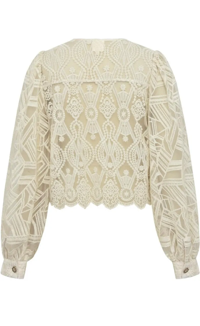 Blusen er gennemsigtig og har mange blonder.