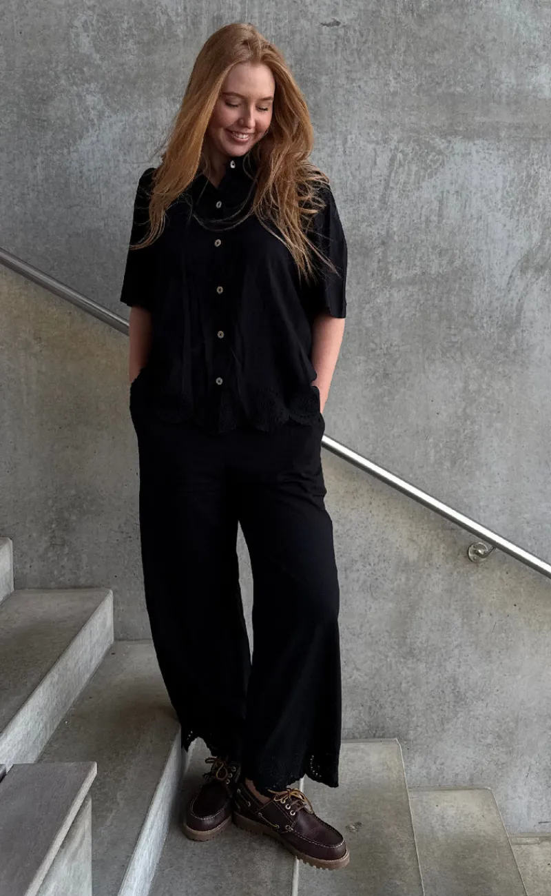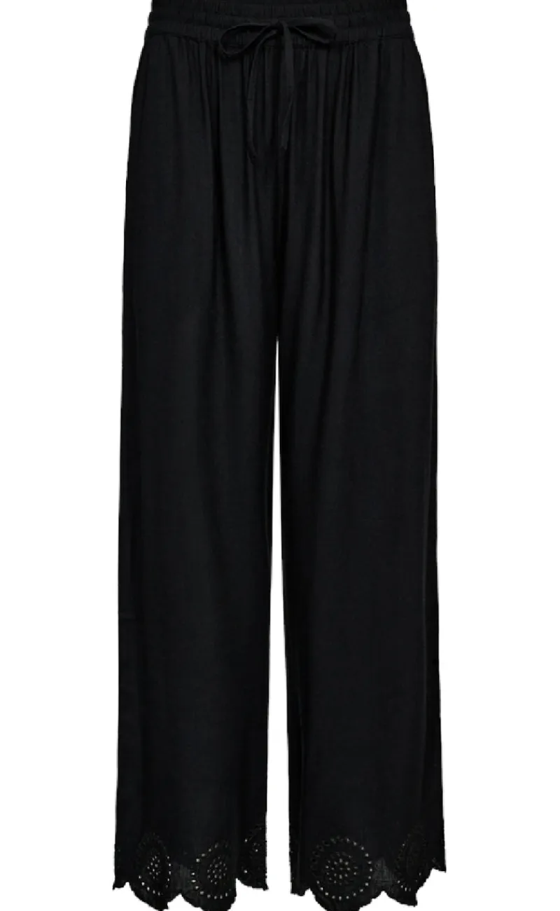 Sorte bukser fra Freequent, i et flot print som har nogle fine broderi anglaise detaljer forneden.