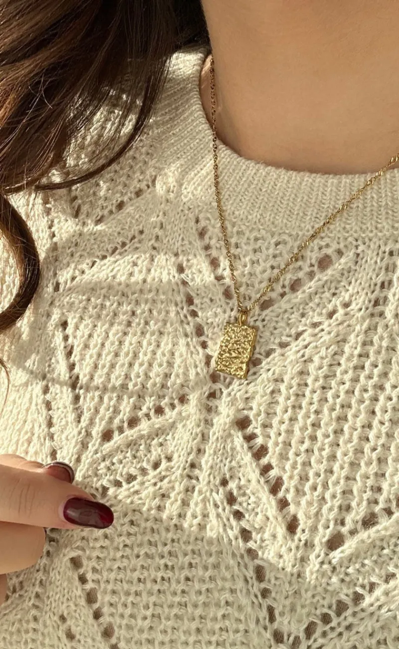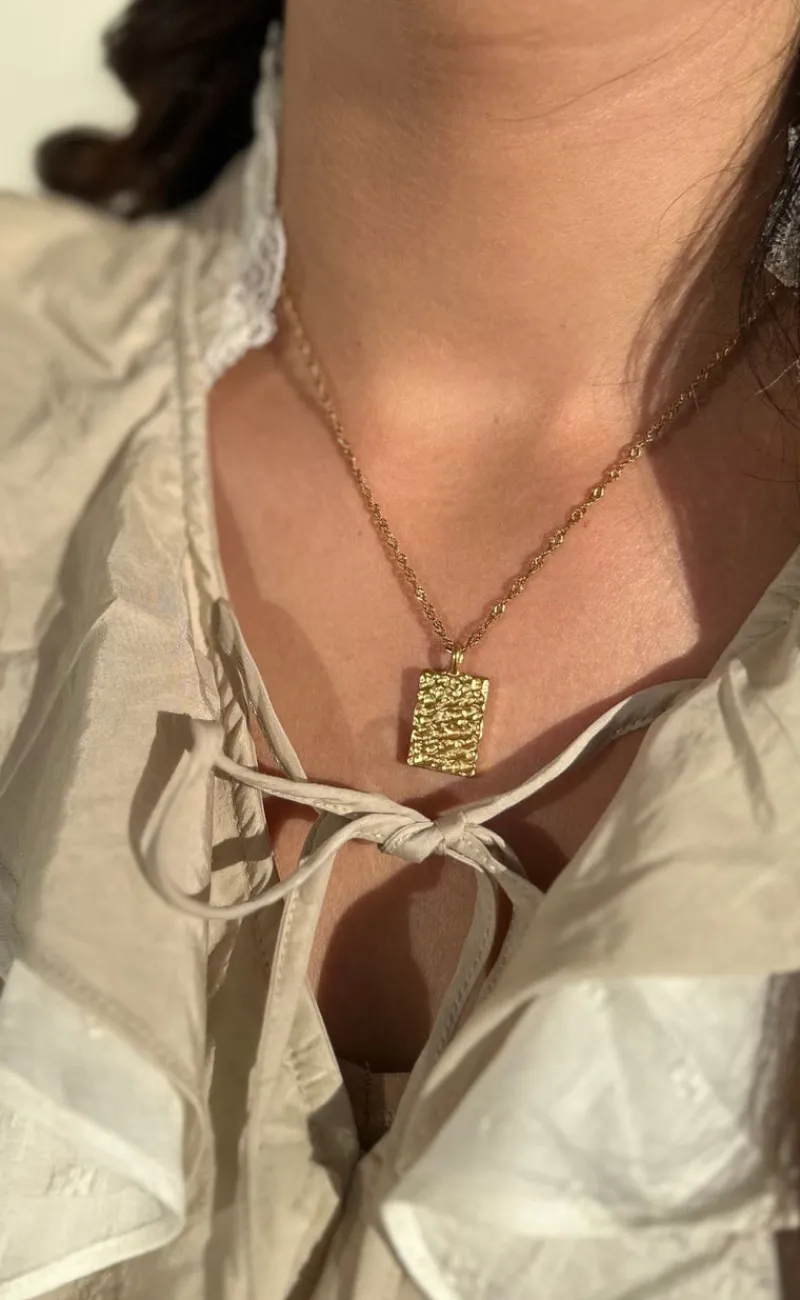 Flot halskæde fra Smykkeli Copenhagen i guld med et firkantet vedhæng, der har en hamret overflade. Den perfekte halskæde til både hverdag og særlige lejligheder!