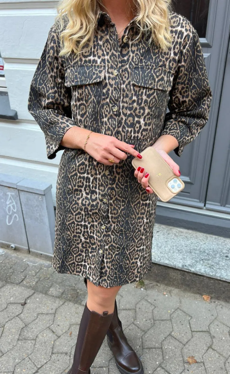 Kjolen har brede 3/4 ærmer og en åbning med flotte knapper på fronten.