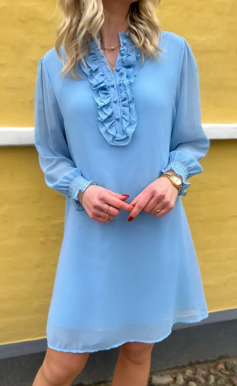 Smuk kjole fra INA Copenhagen i lyseblå med de fineste flæser fortil.