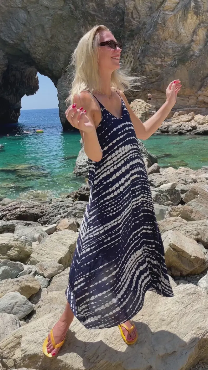 Flot kjole fra INA Copenhagen i navy med tie dye print i hvid.