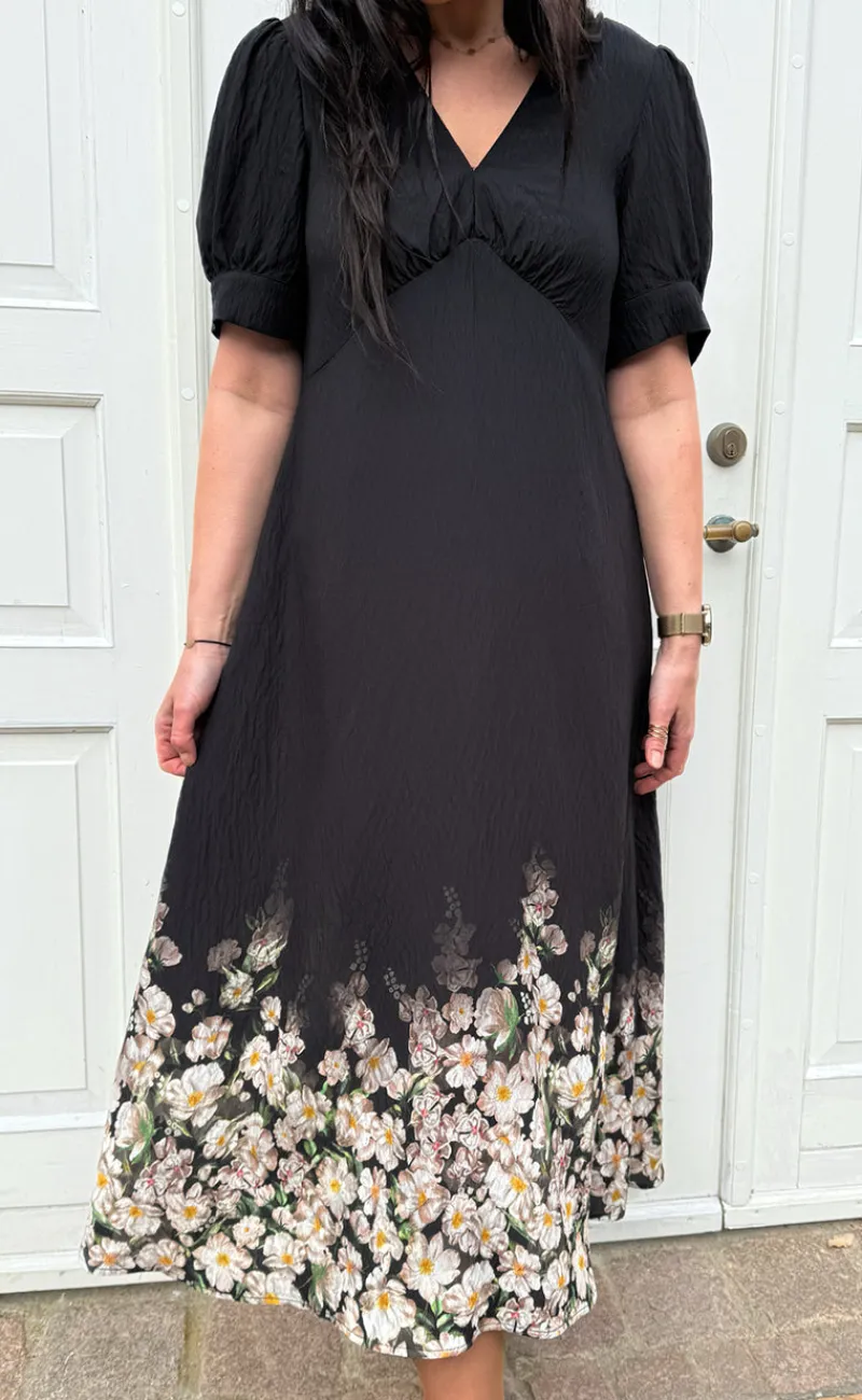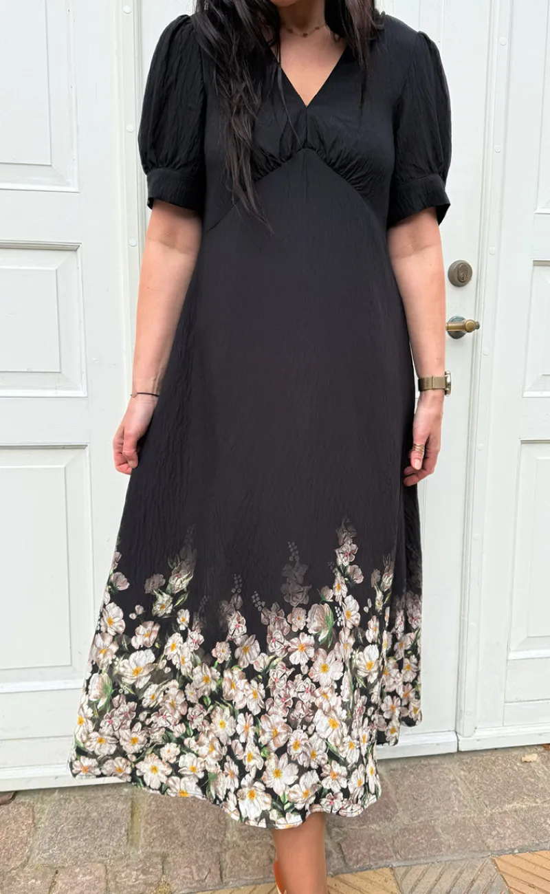 Smuk kjole fra INA Copenhagen i sort med det fineste blomsterprint nederst på kjolen.