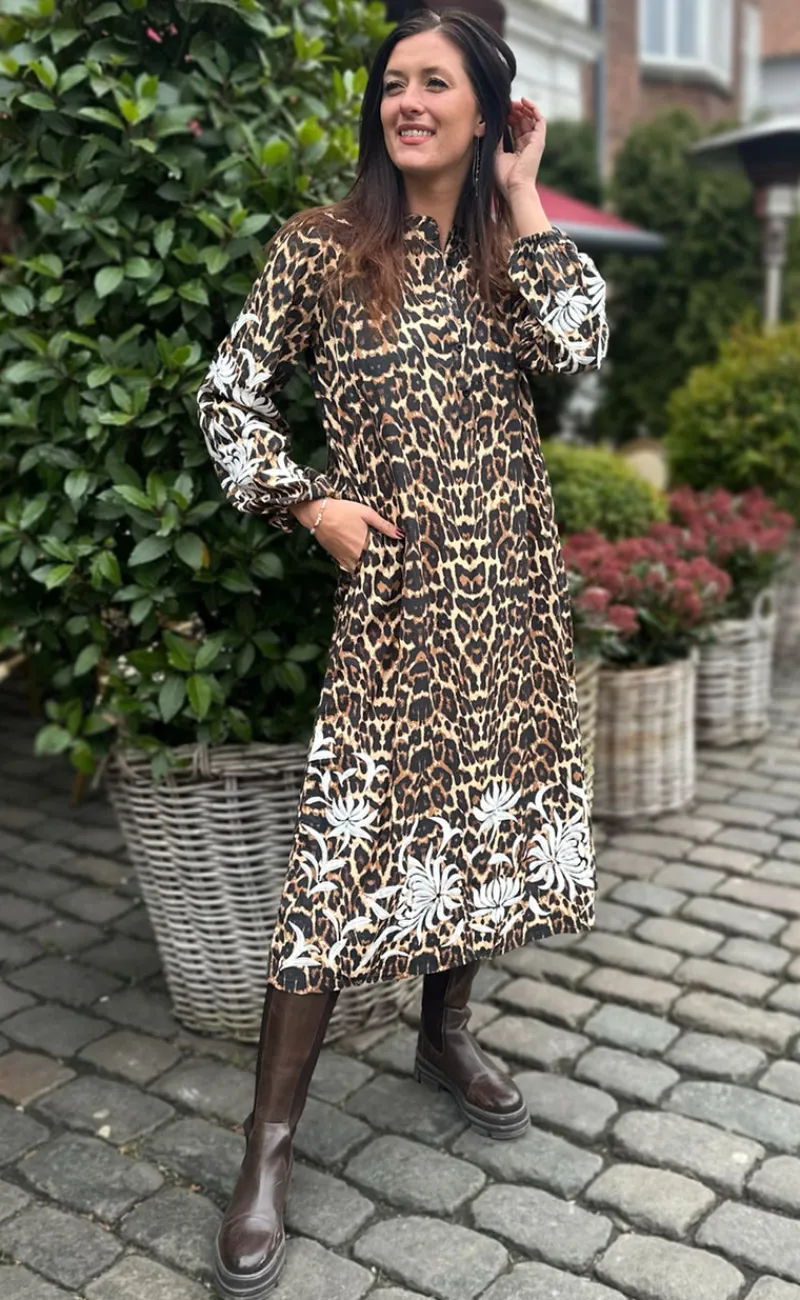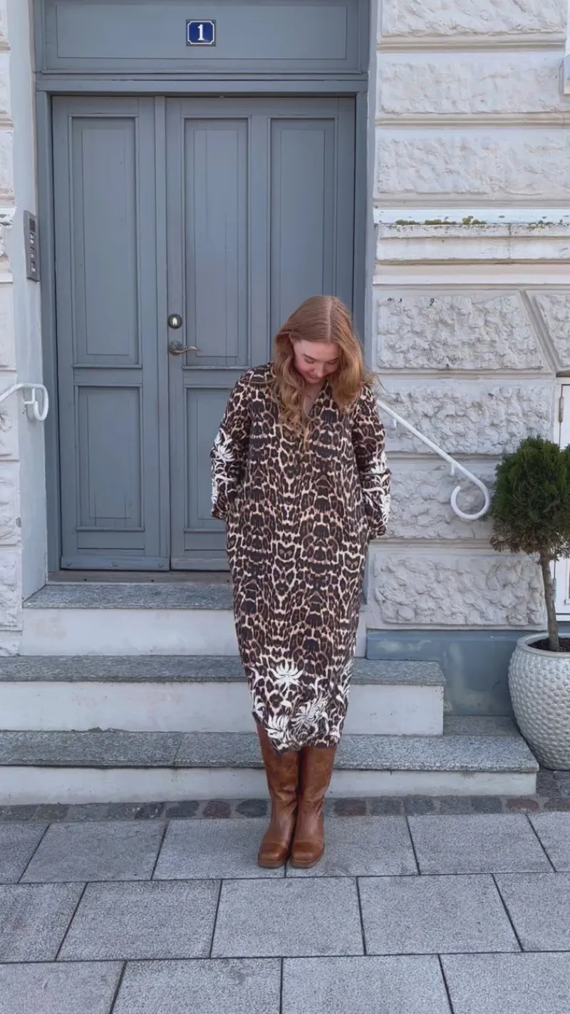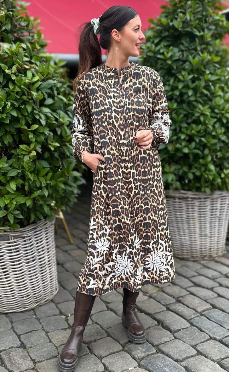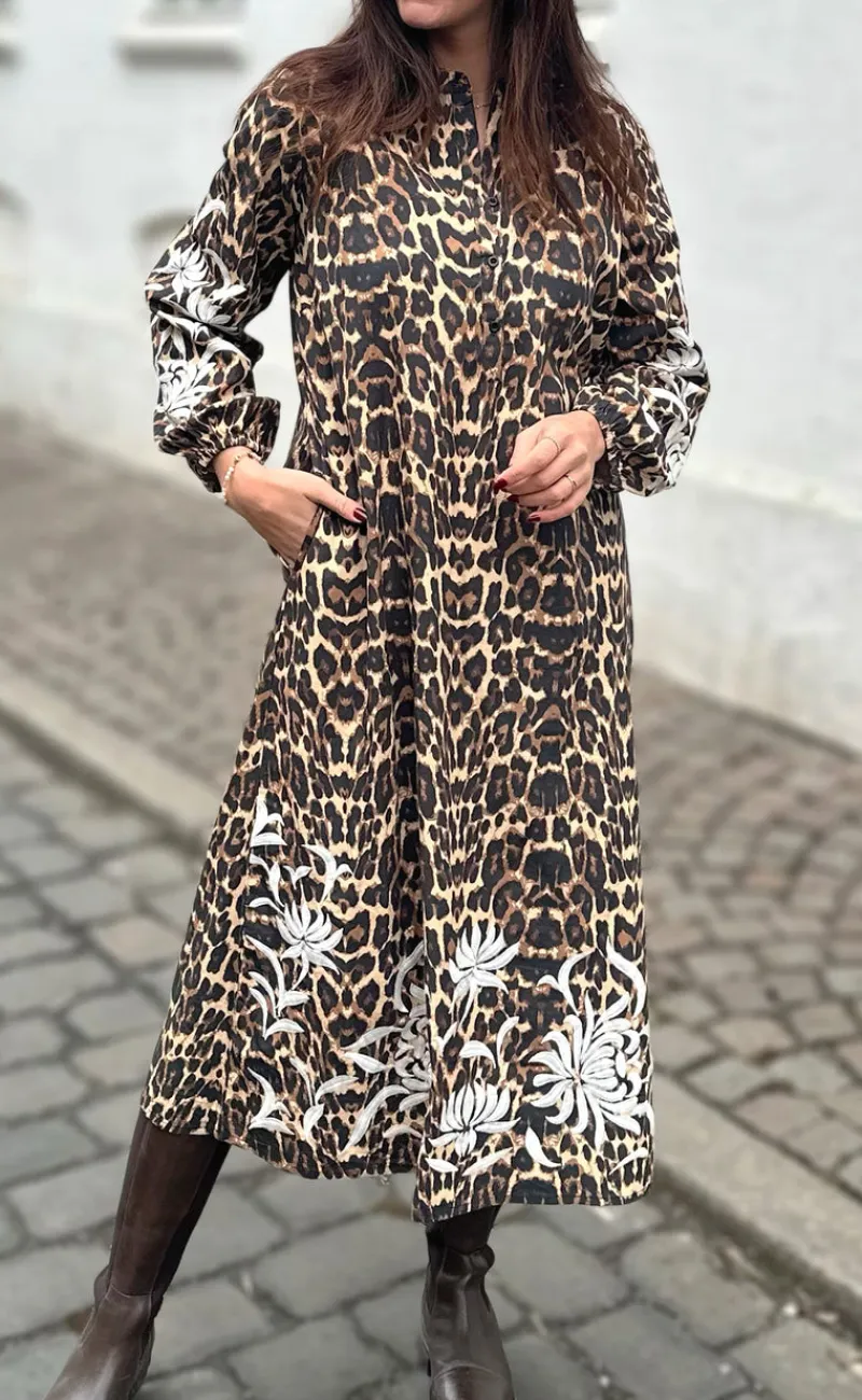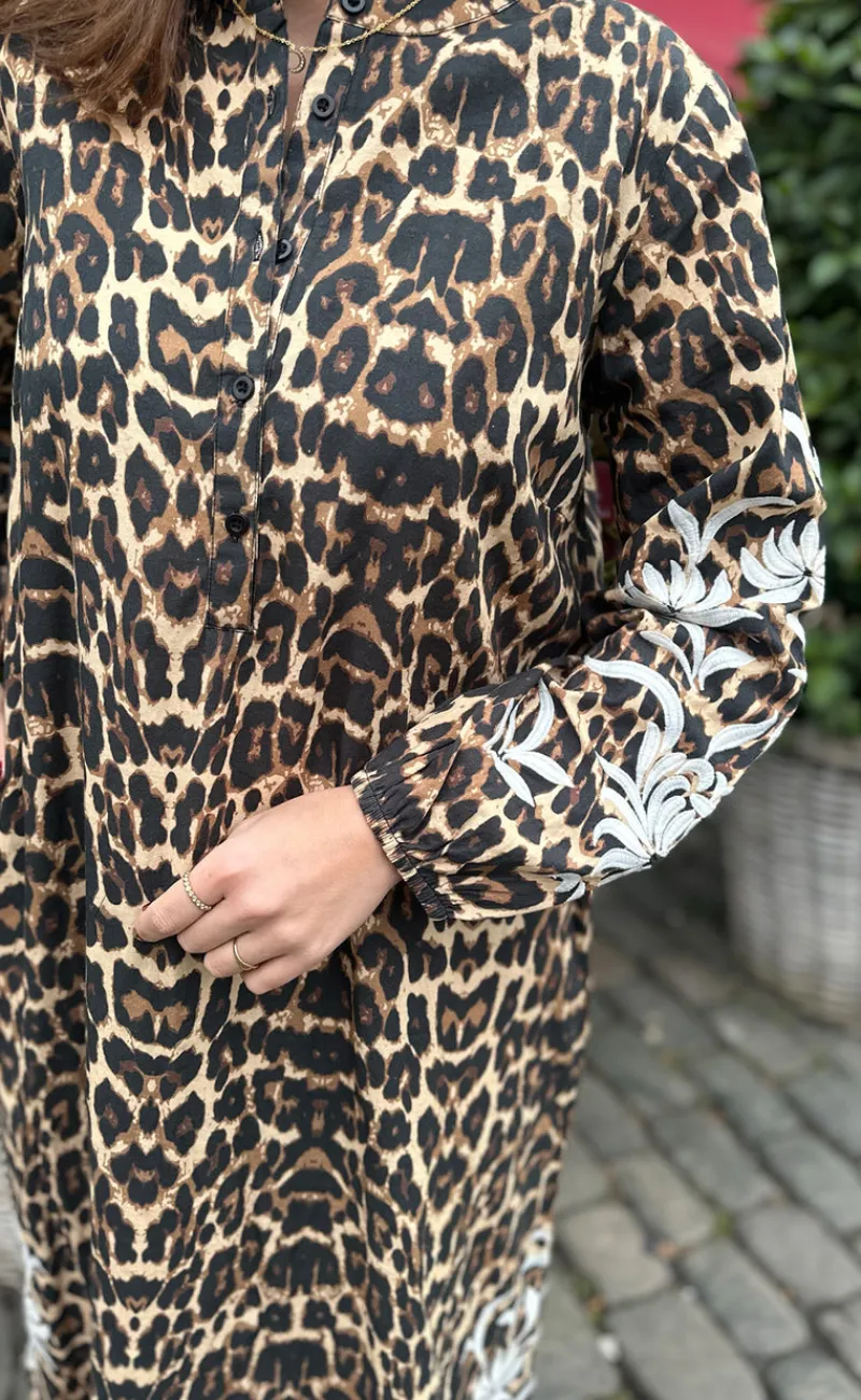 Fin kjole fra INA Copenhagen med leopard print og et flot broderet mønster på ærmerne og i bunden af kjolen i hvid.