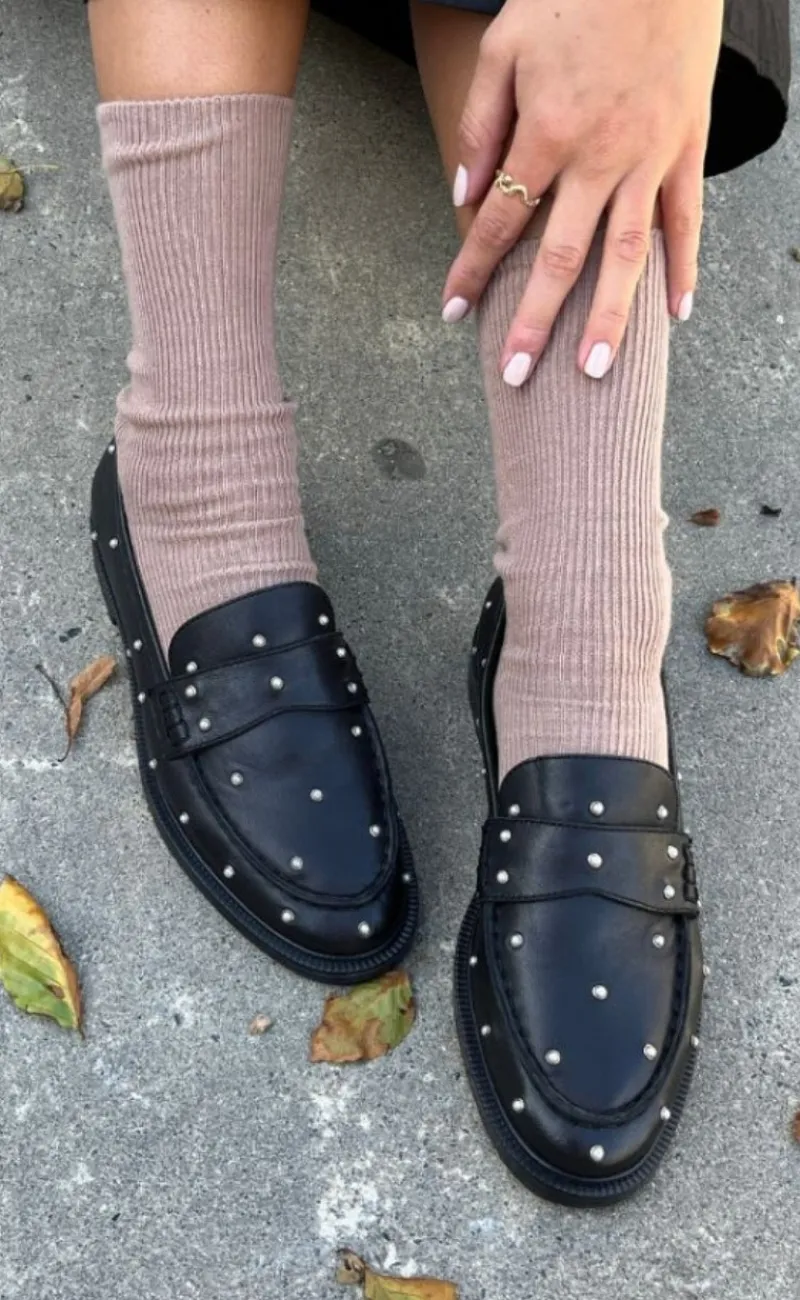 Disse loafers kommer i en lækker skinnende kvalitet udmsykket med små perler rundt på skoen.