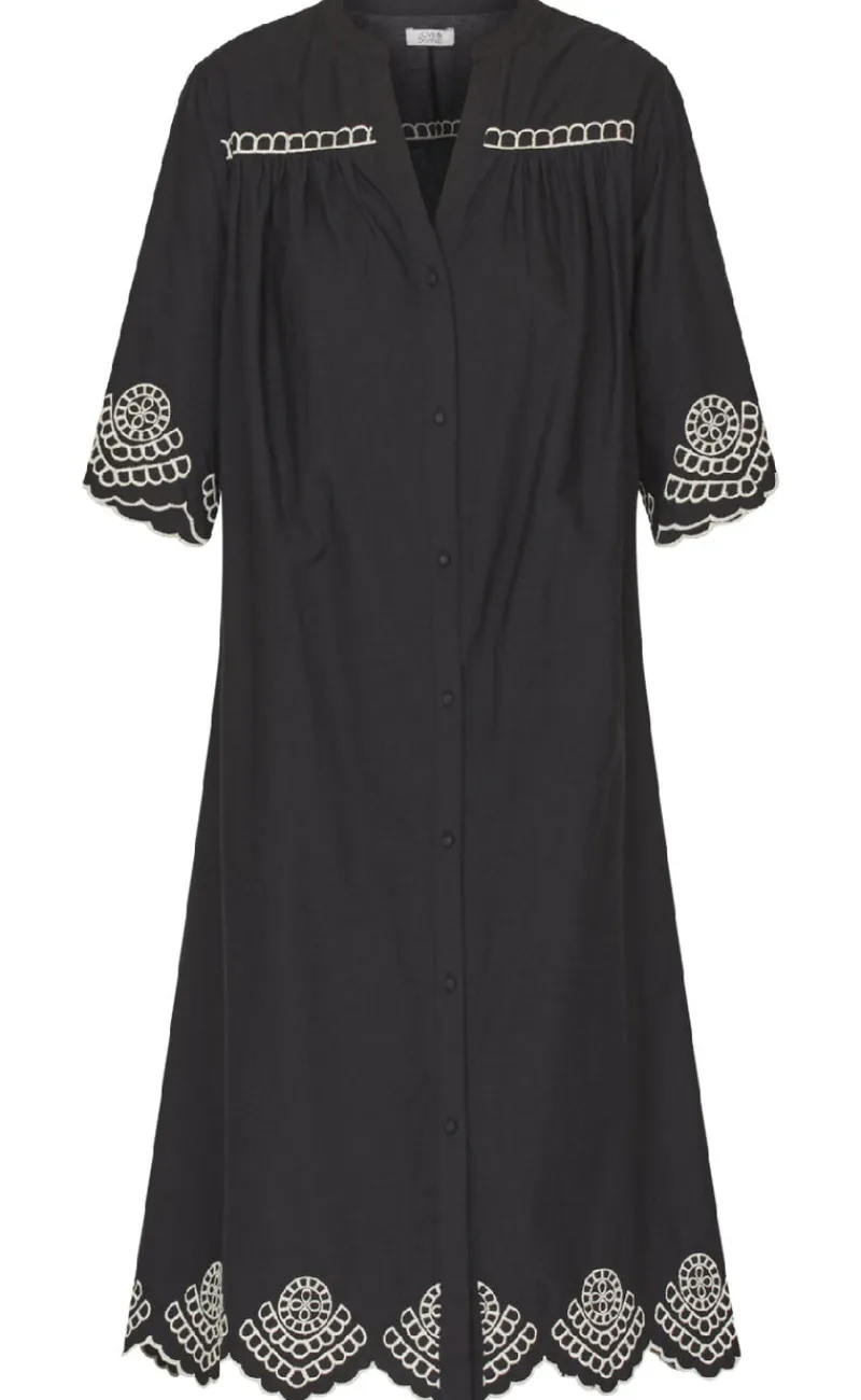 Lang sort skjortekjole fra Love & Divine med et hvidt hulmønster.