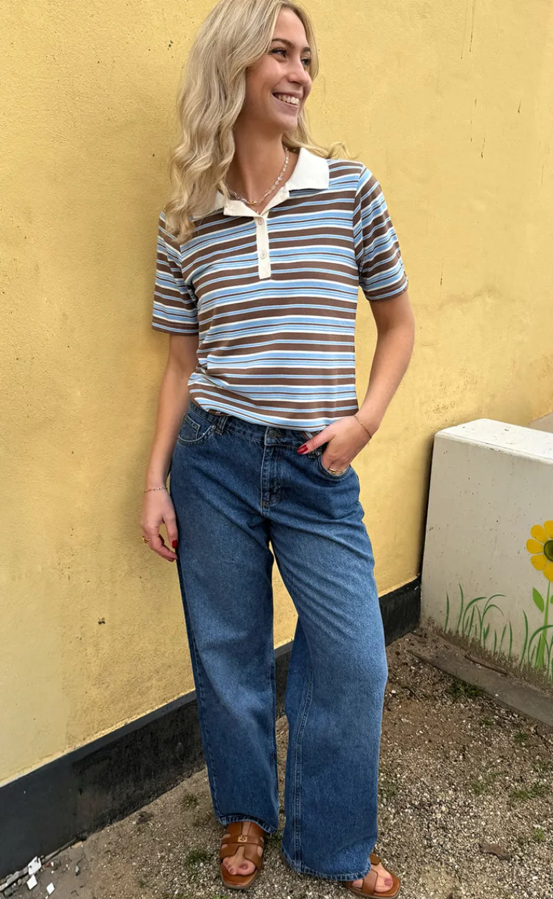 Smart polo t-shirt fra INA Copenhagen med striber i blå, brun og hvid.