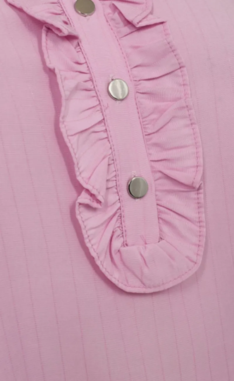 Skjorten har lange ærmer med let puf ved skulderen og en fin stolpeåbning med guld knapper og flæse-detaljer. Der er en fin runding ved bunden, så skjorten har en flot pasform.