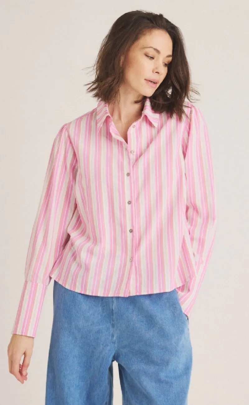 Skjorten har en smule puf i skulderen og lange ærmer.