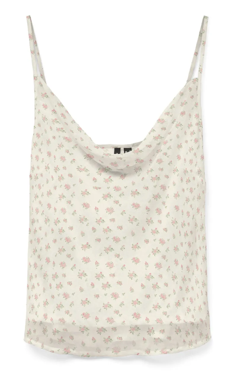 Sød top fra Vero Moda i hvid med blomster, med tynde stropper og vandfaldsudskæring.