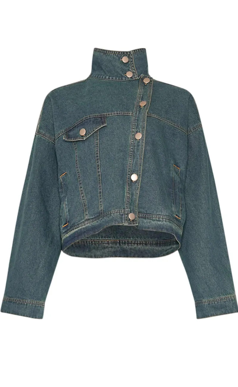 Jakken har en høj krave og knappelukning.