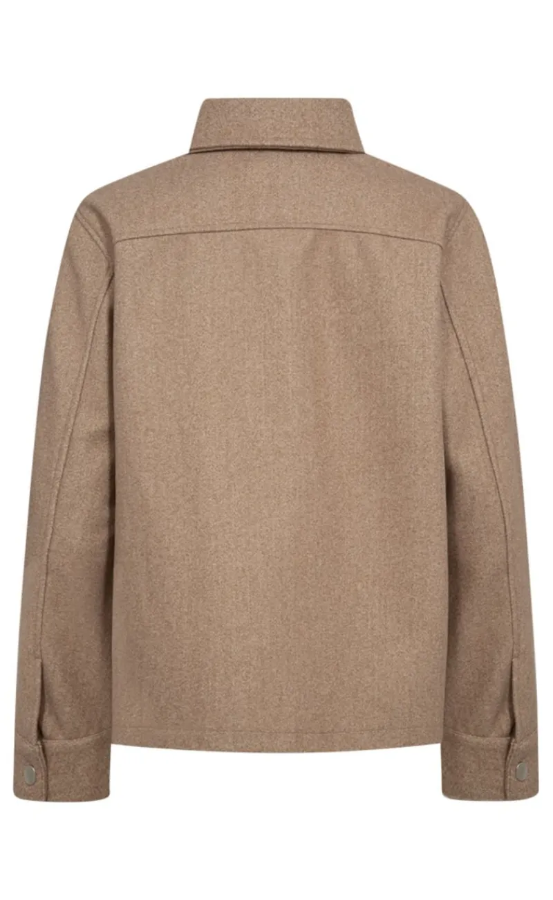 Denne jakke er i en beige farve. Har to store lommer, en krave og knapper.