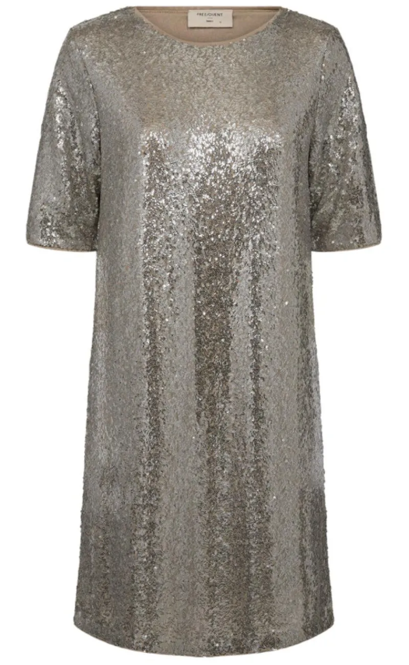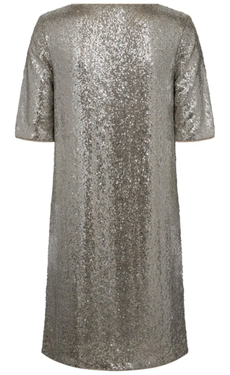 Kjolen har en lige pasform, en rund halsudskæring samt korte ærmer.