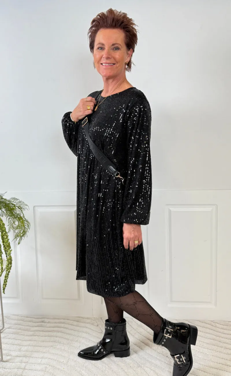 Pæn lang kort kjole. Denne kjole er sort og har palietter.