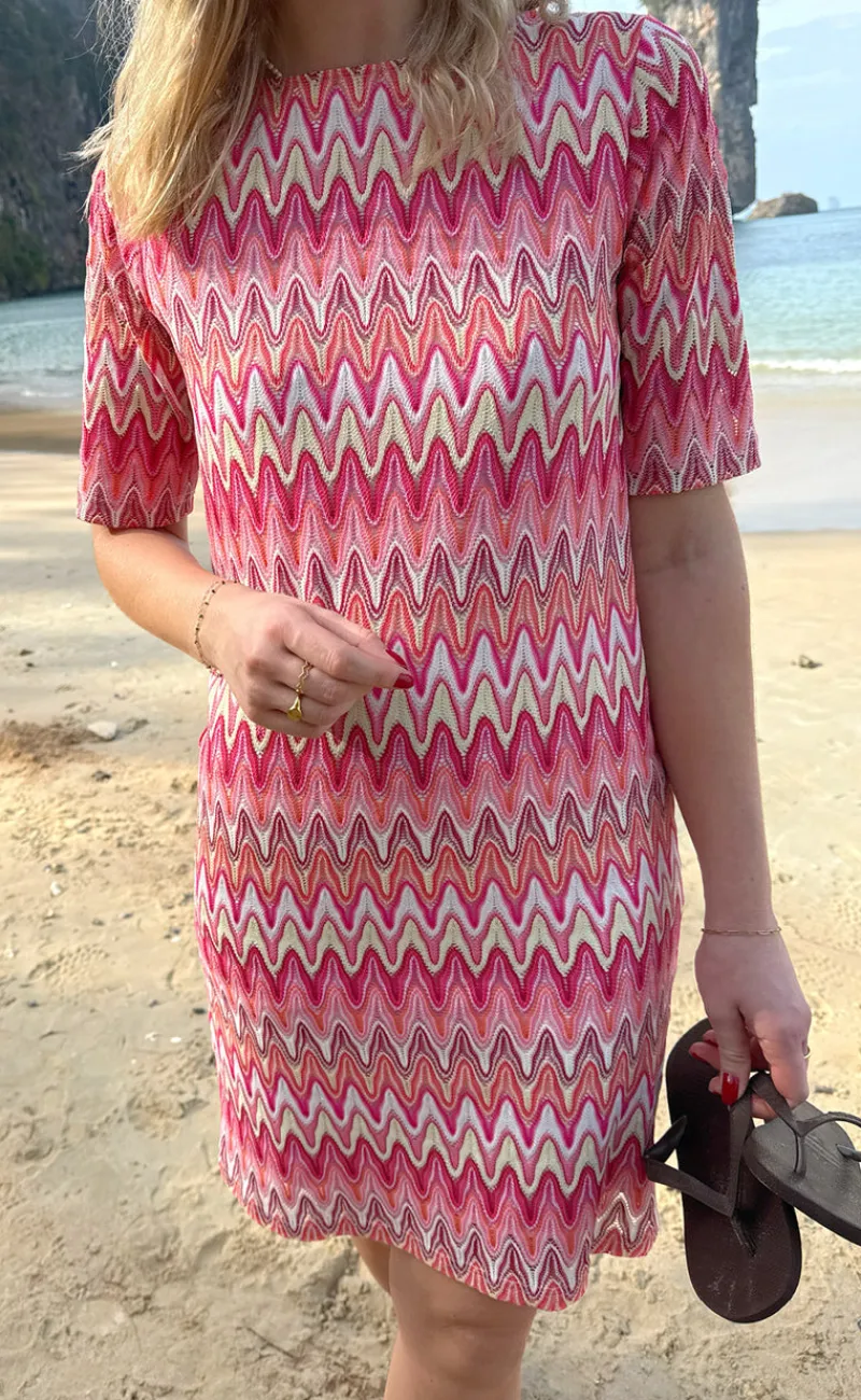 Smart kjole fra INA Copenhagen med zigzag mønster i pinke nuancer og lurex glitter tråde.