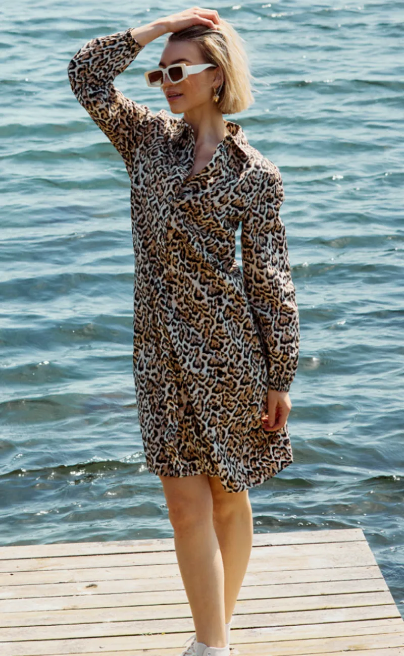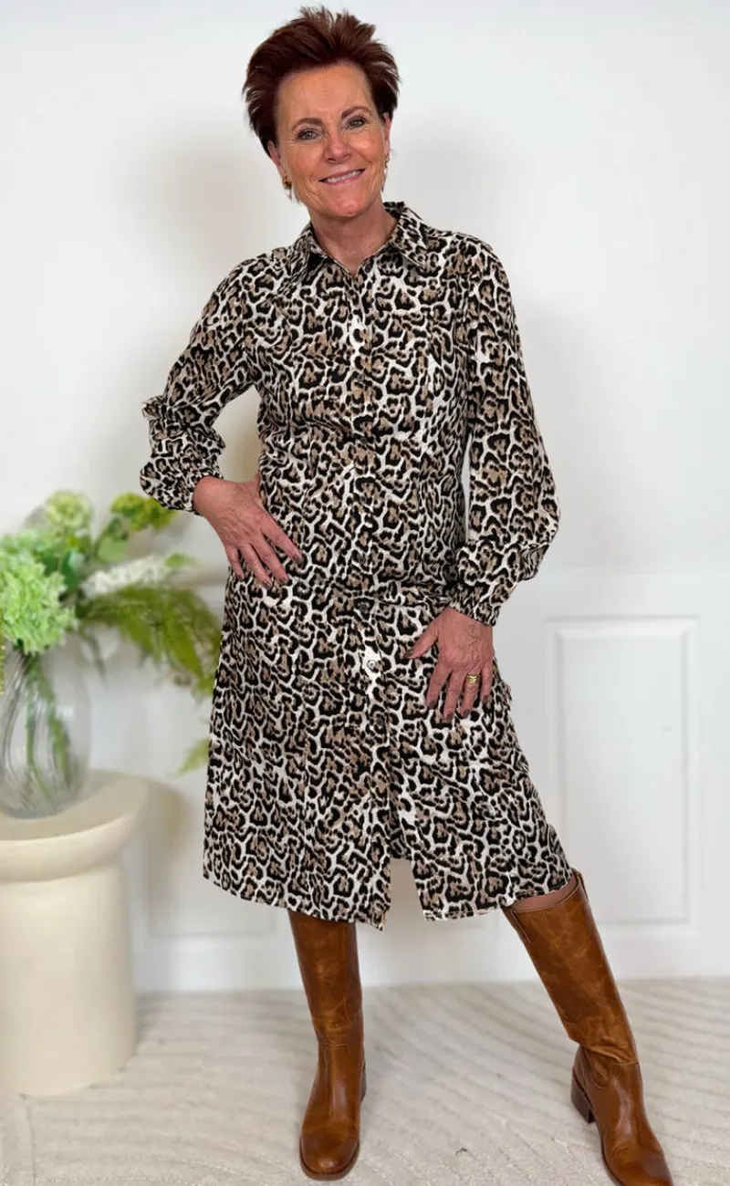 Kjolens længde går til lige over knæet, den har lange ærmer samt en knaplukning.