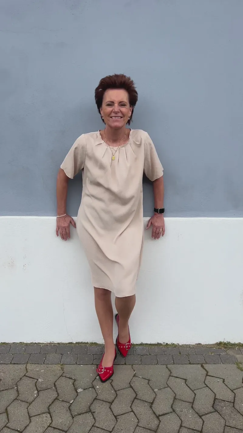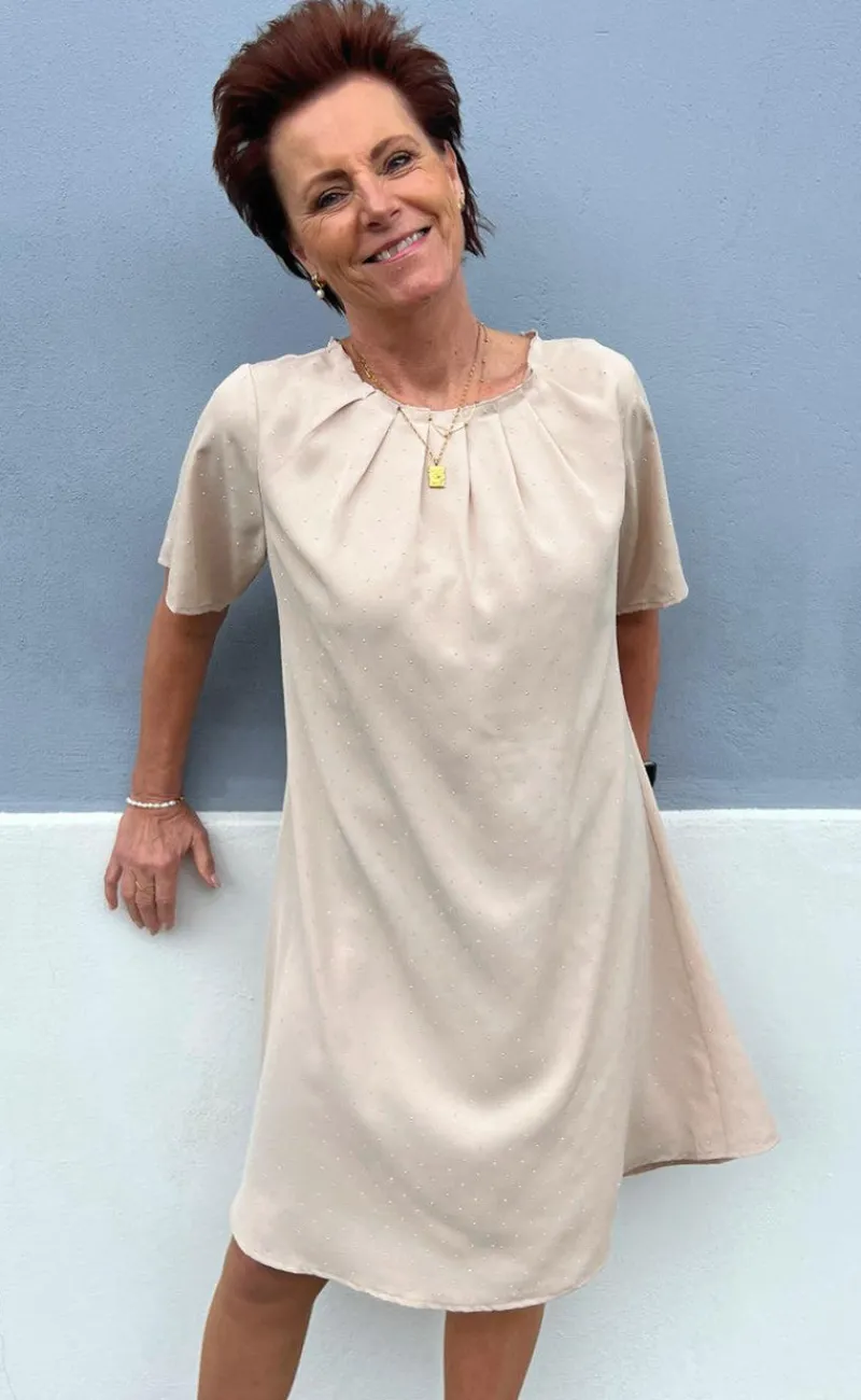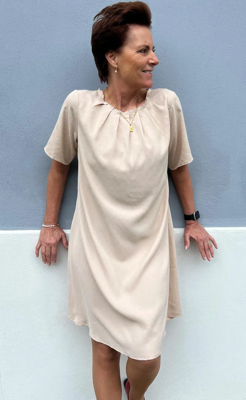 Smuk og eksklusiv kjole fra INA Copenhagen i beige med similisten.