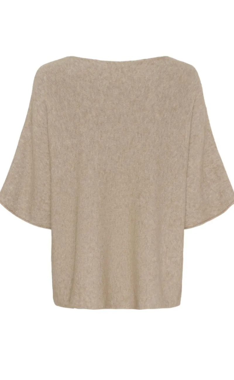 Blusen har brede ærmer, en rund hals samt en løs pasform.