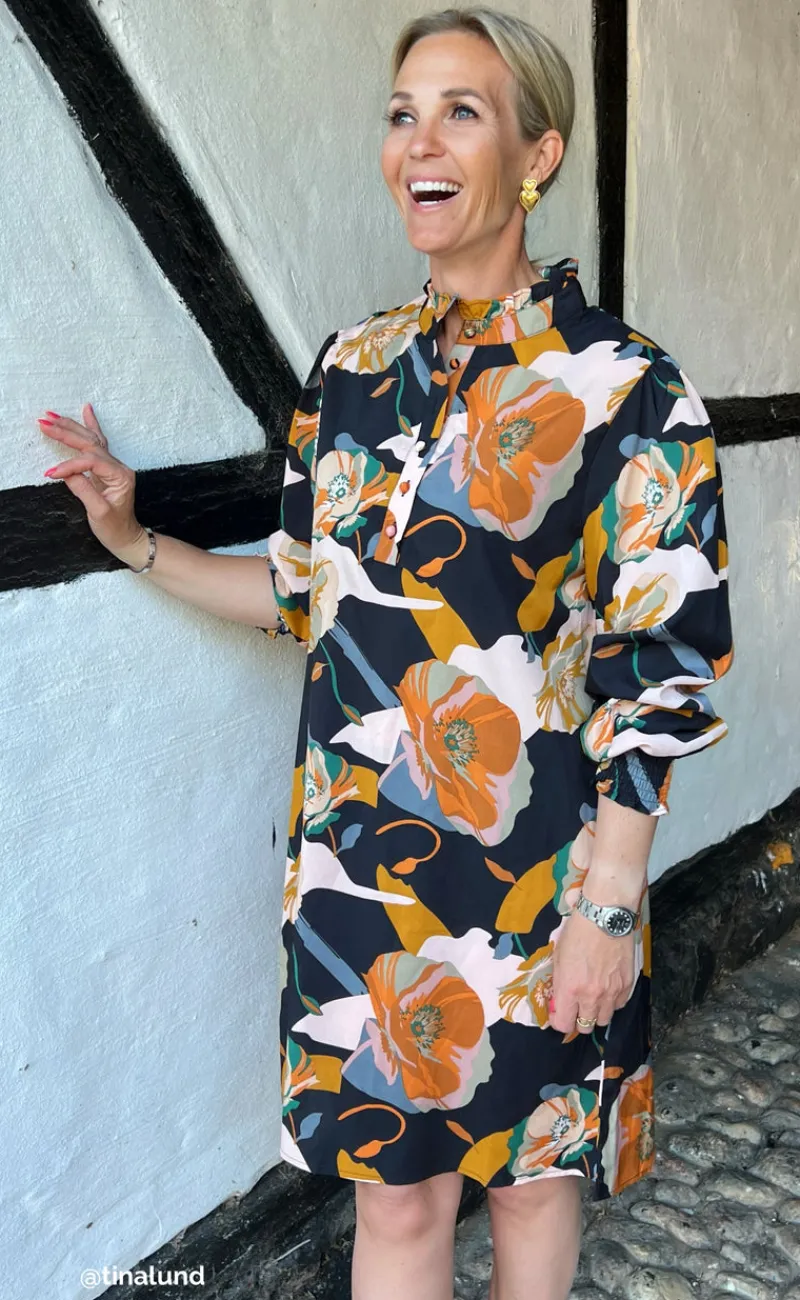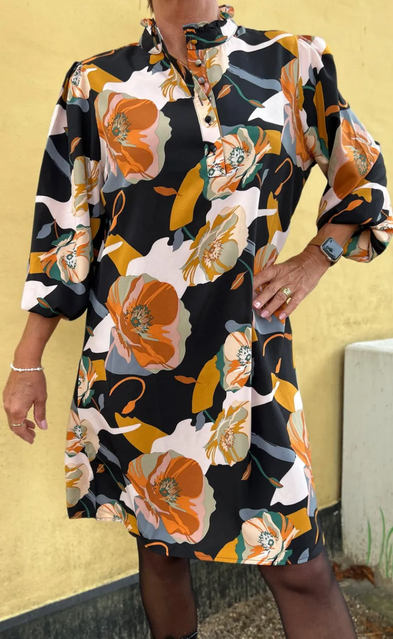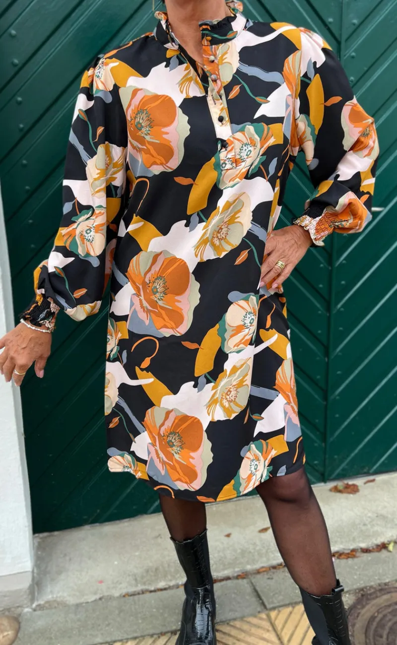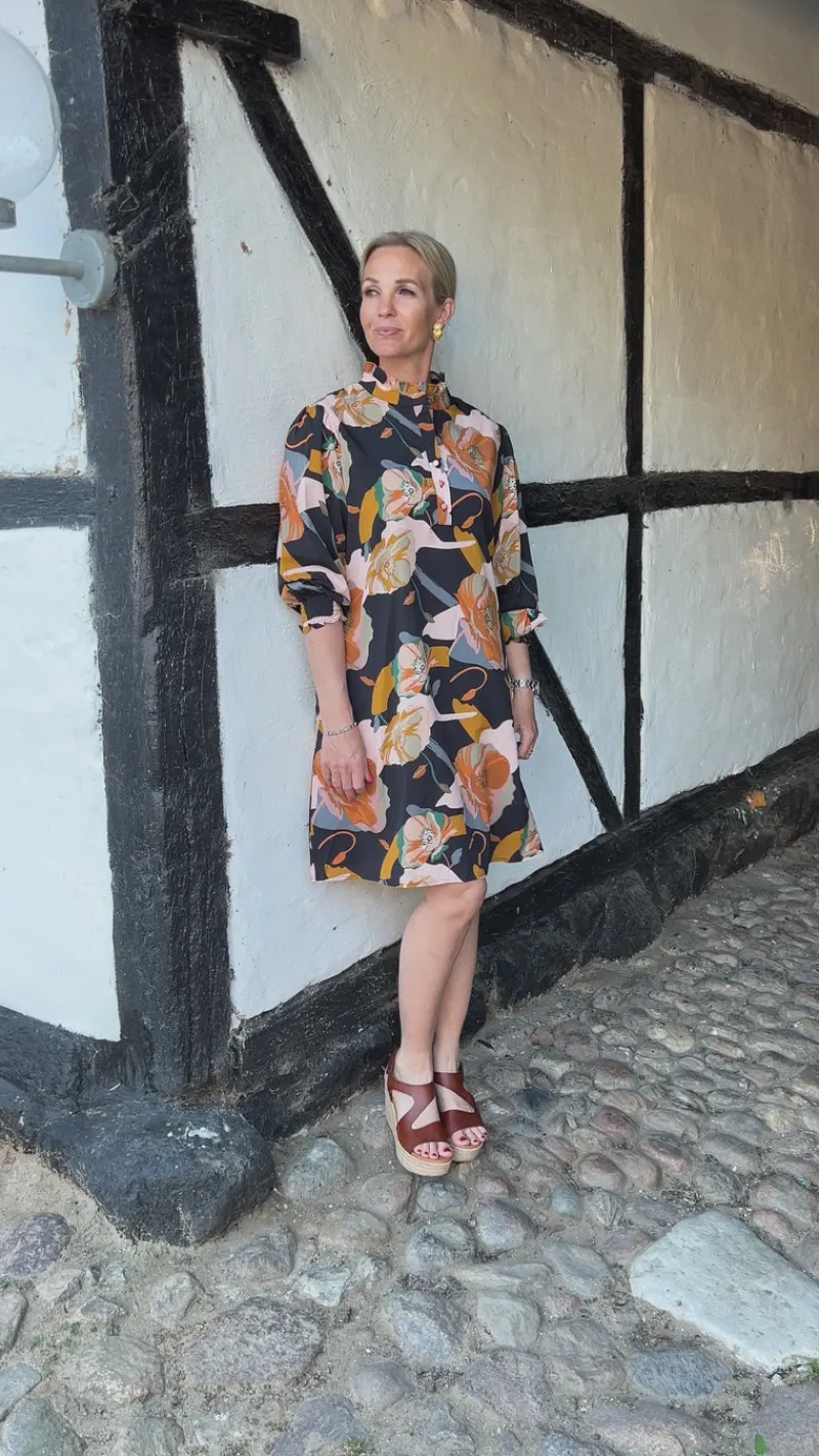 Smuk kjole fra INA Copenhagen i sort med blomsterprint.