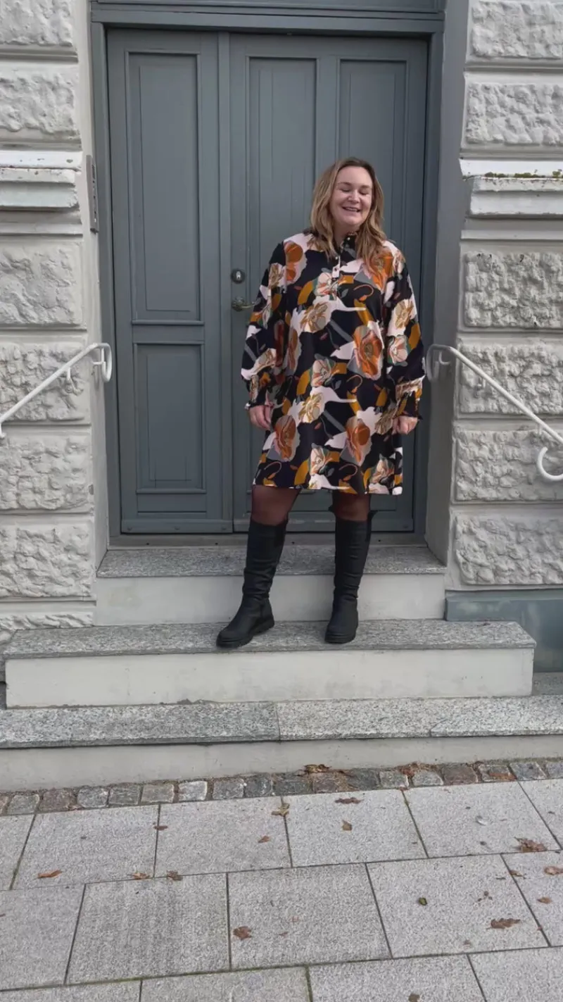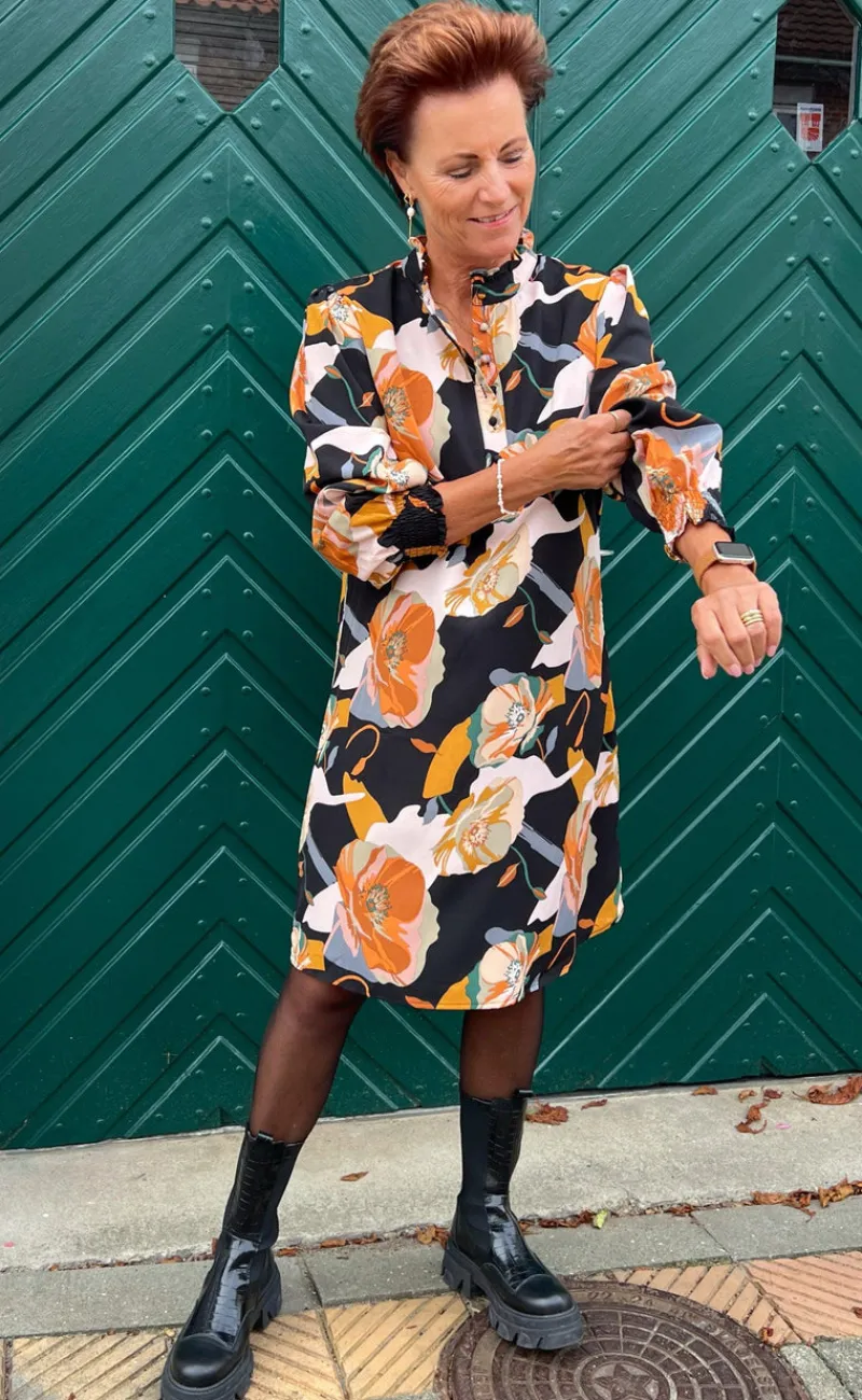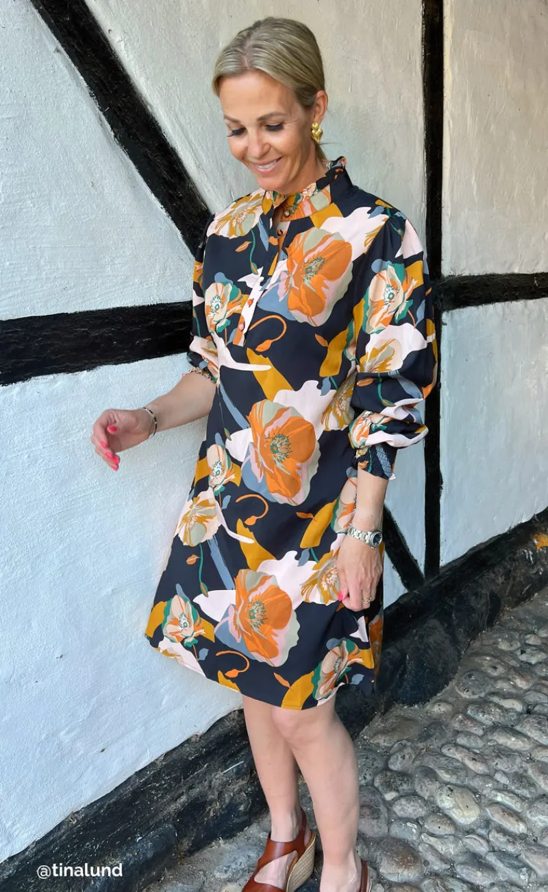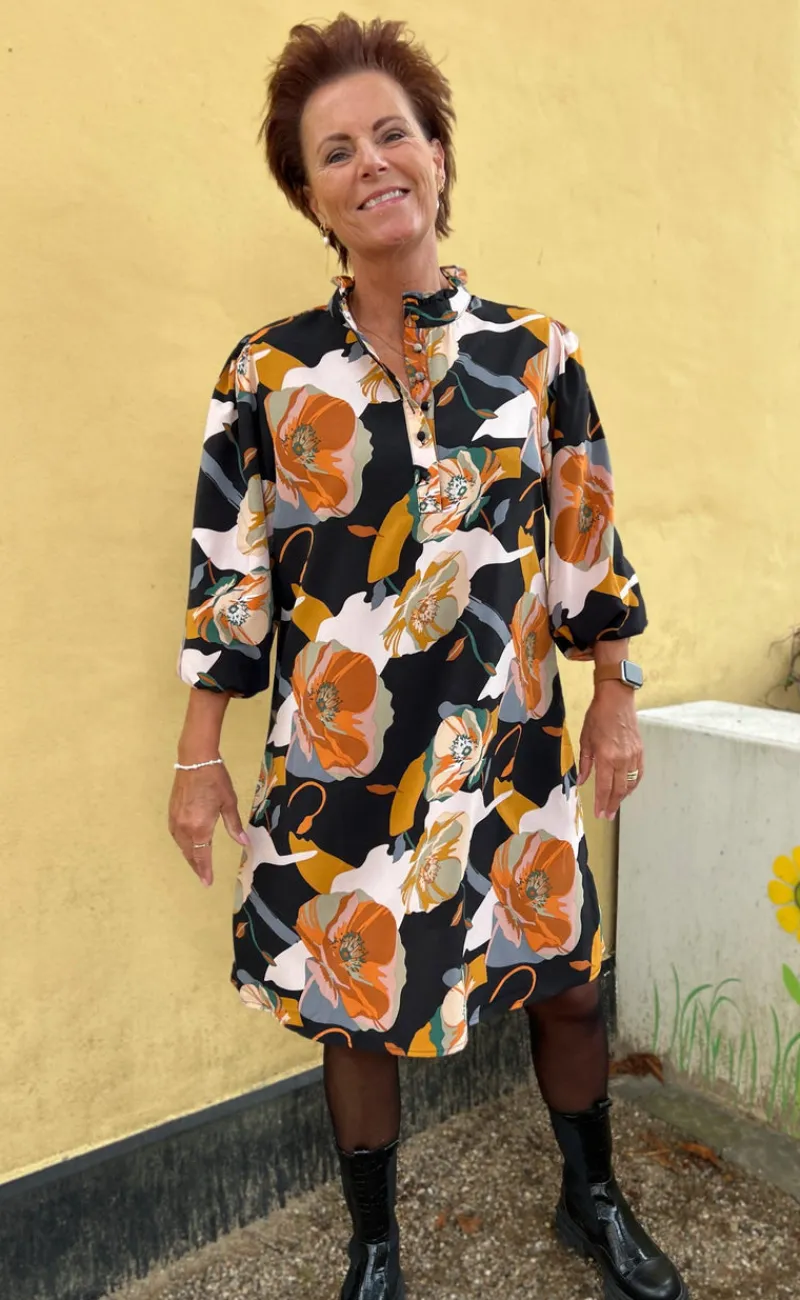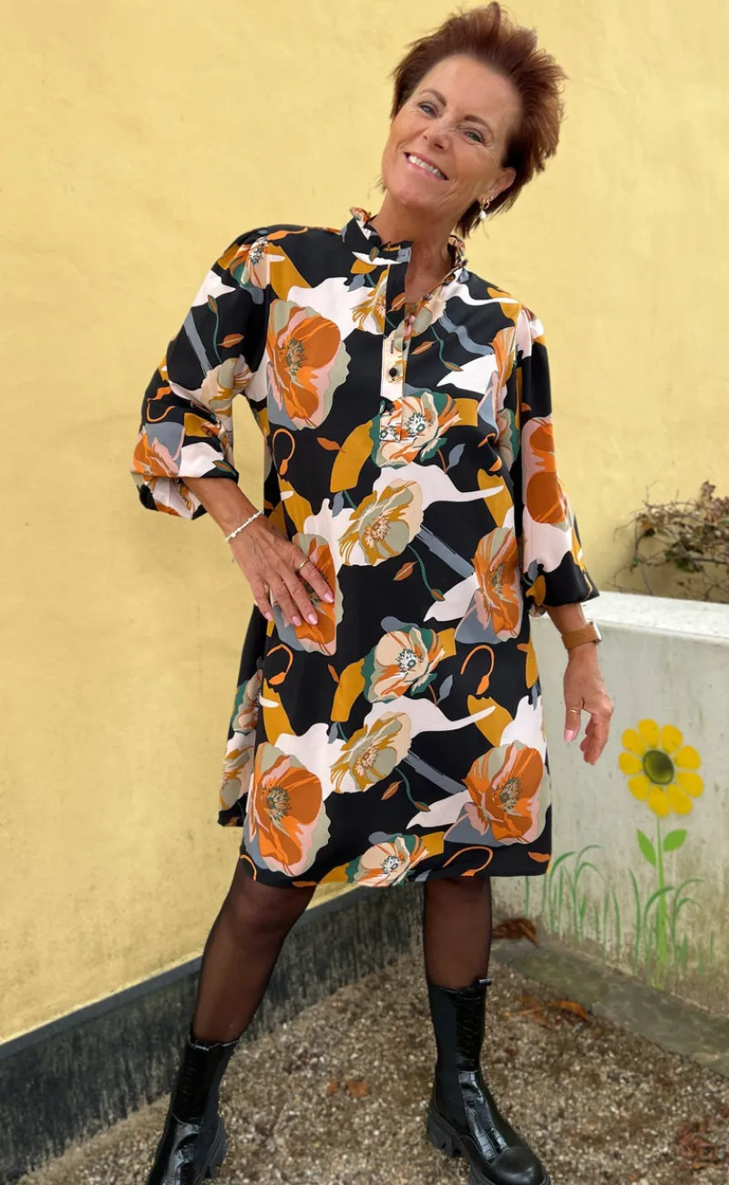 Smuk kjole fra INA Copenhagen i sort med blomsterprint.