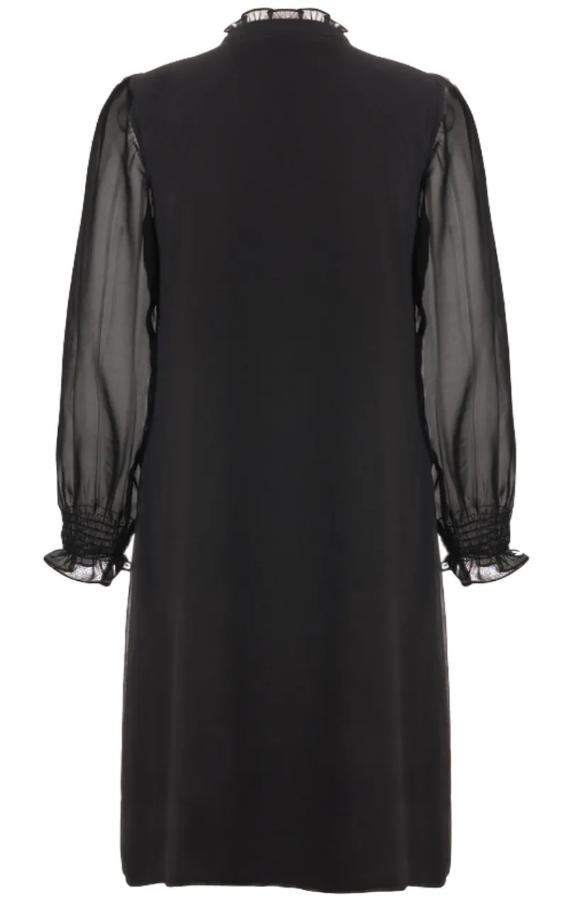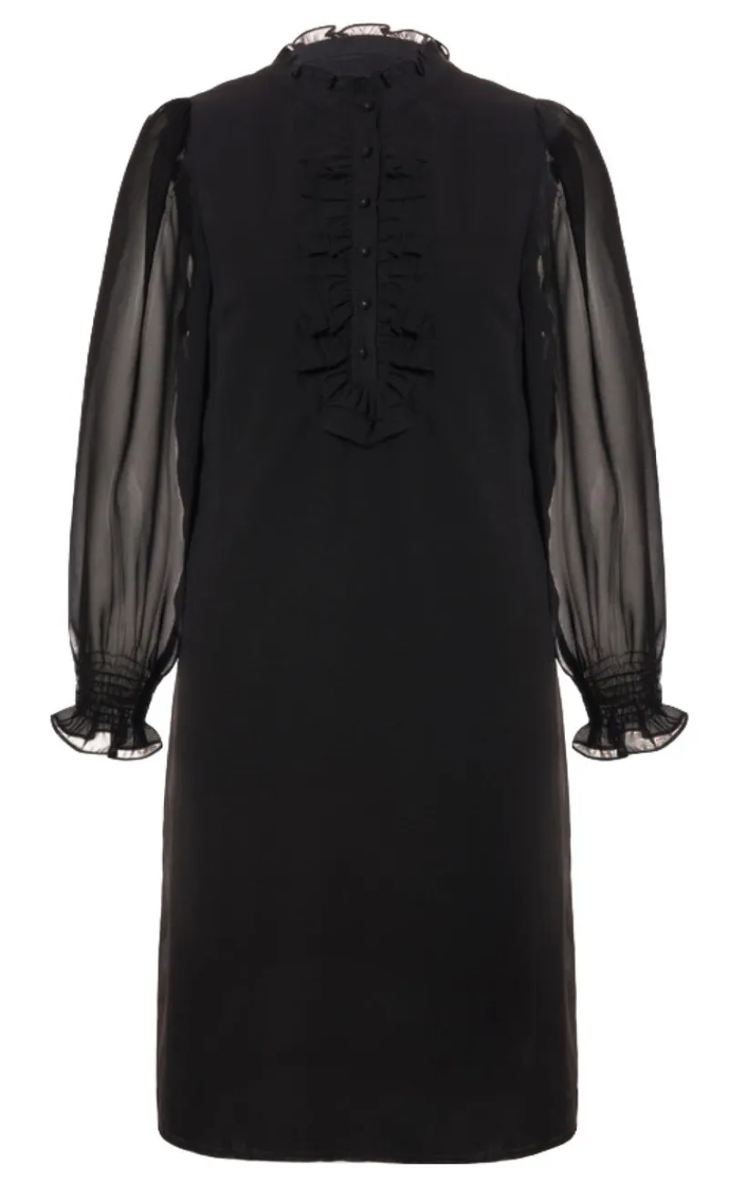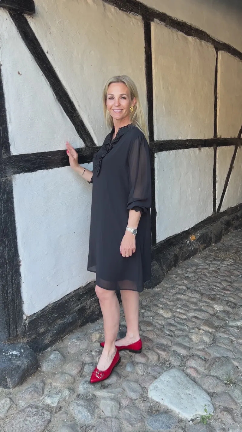 Smuk kjole fra INA Copenhagen i sort med de fineste flæser på fronten.