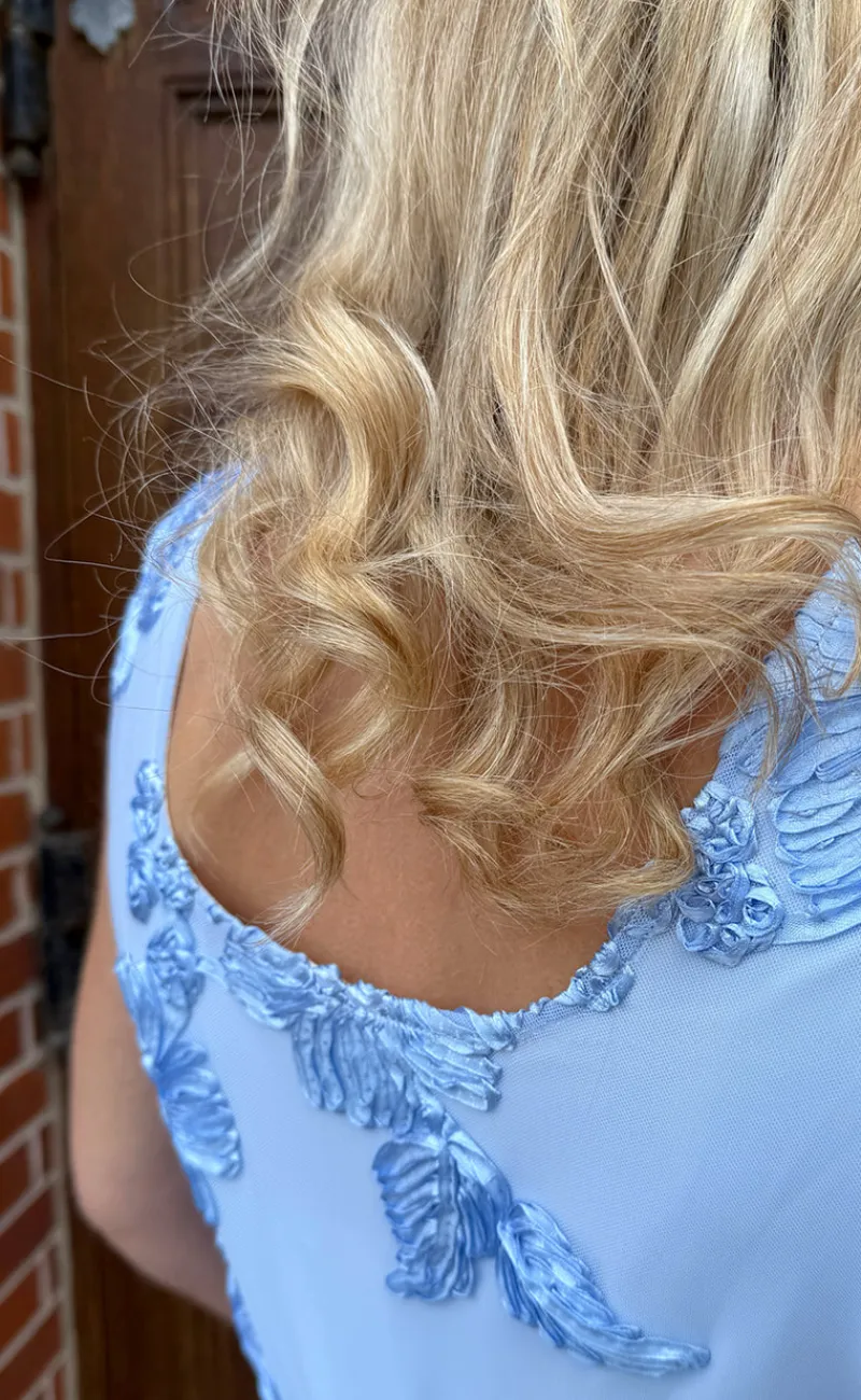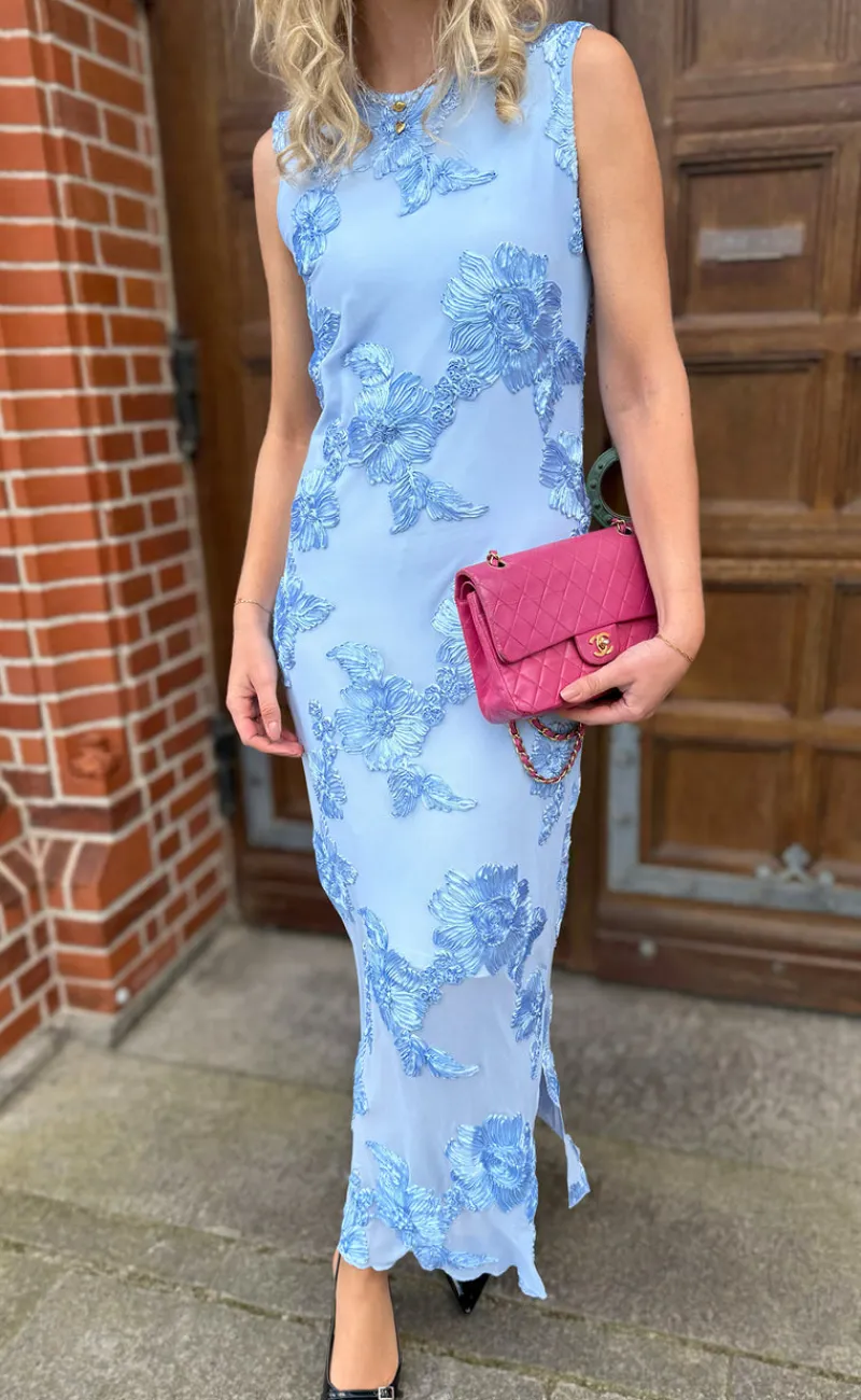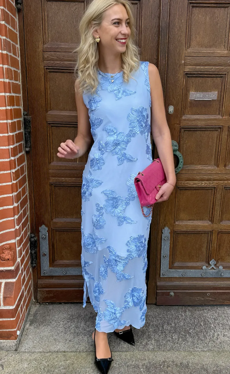 Elegant og eksklusiv kjole fra Say INA Copenhagen i blå mesh med flotte 3D blomster.