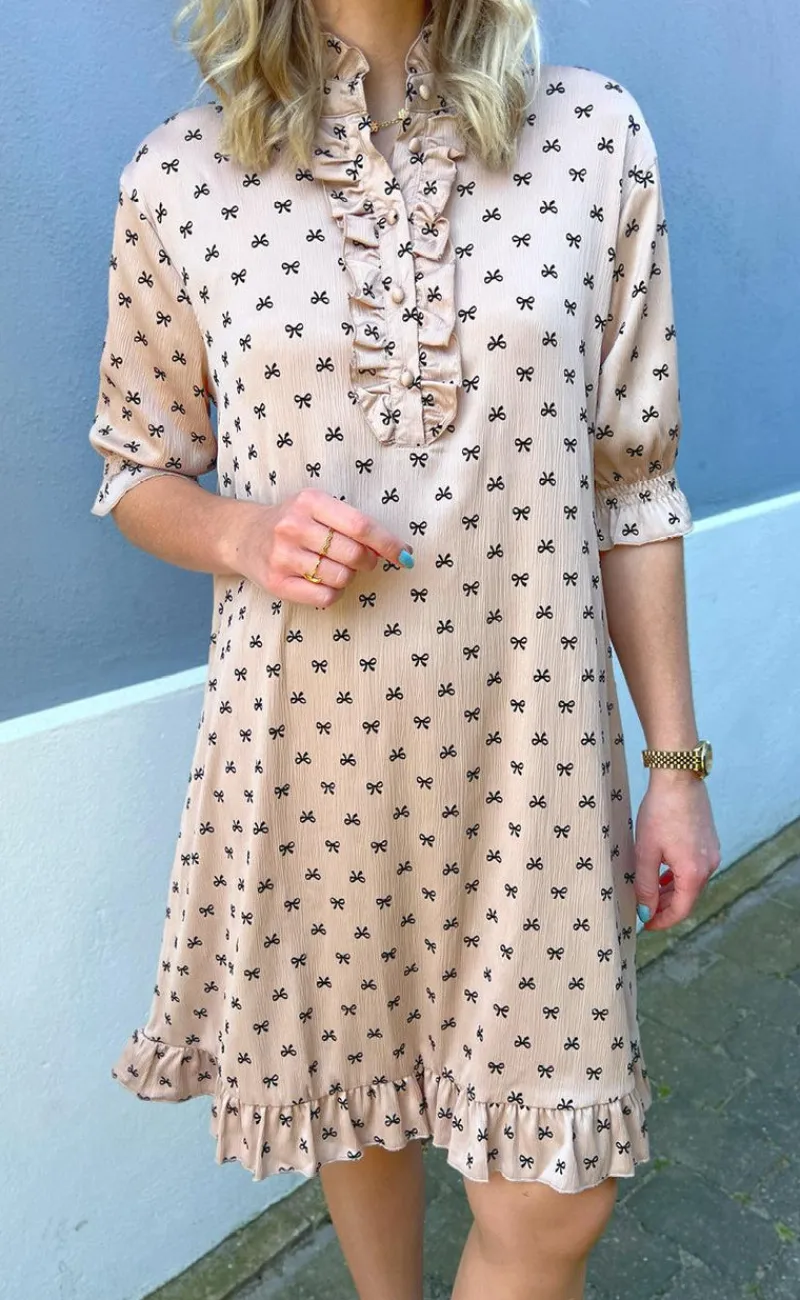 Fin kjole fra INA Copenhagen i en camel nuance med sorte sløjfer.