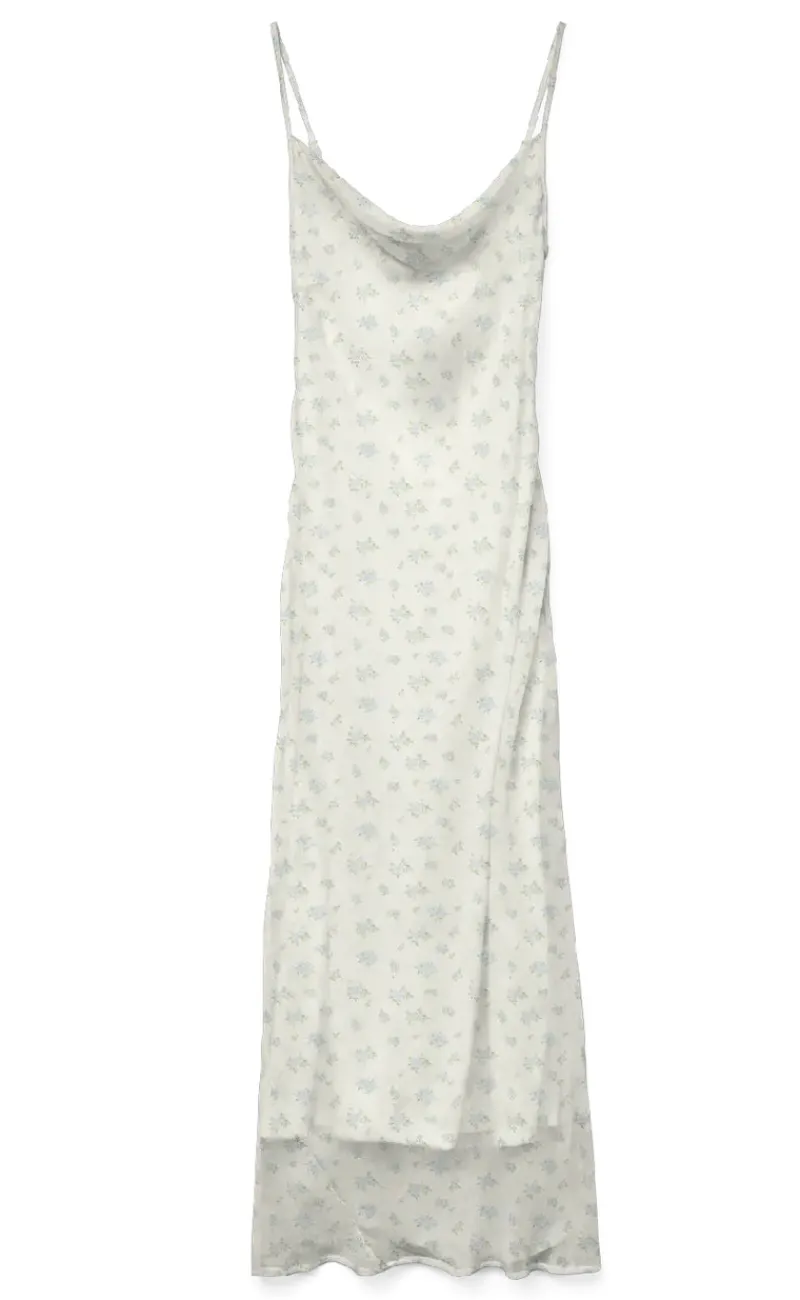 Kjolen har en maxi længde og tynde spaghetti stropper.