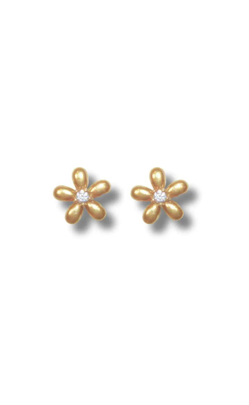 Fine studs fra Smykkeli Copenhagen i guld formet som en blomst med en lille zirconia sten i midten.