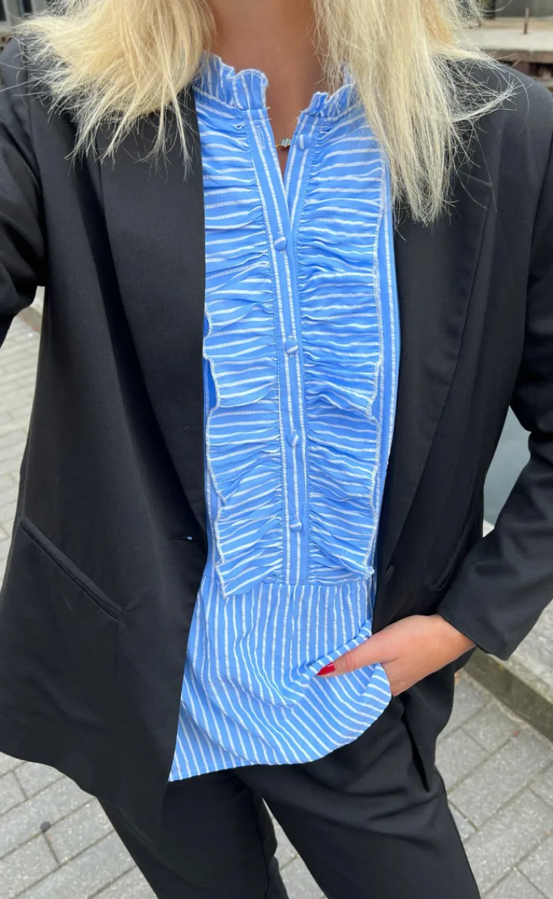 Toppen har et oversize fit, flæse-ærmer og en åbning fortil med flæser omkring.