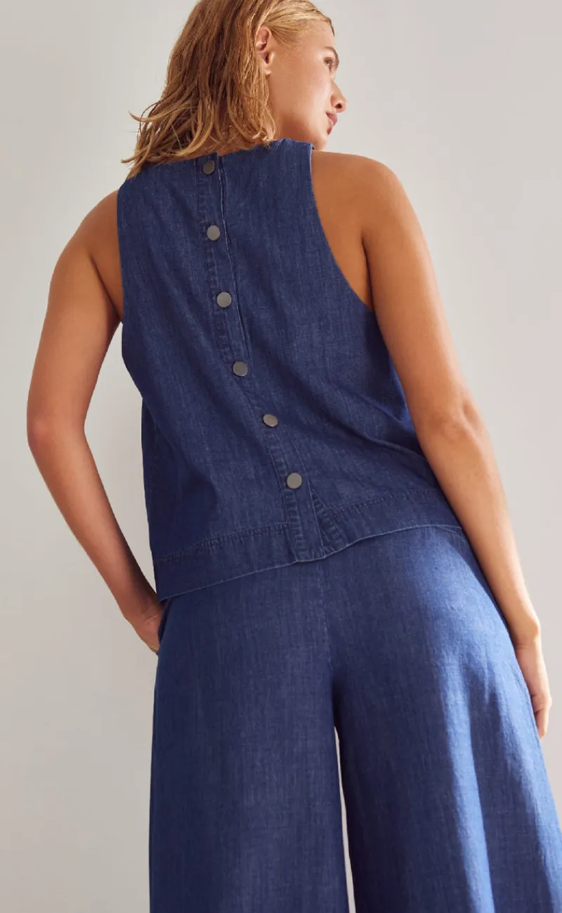 Toppen er ærmeløs og har en rund hals udskæring. Desuden har den en cool knappe effekt bagpå.