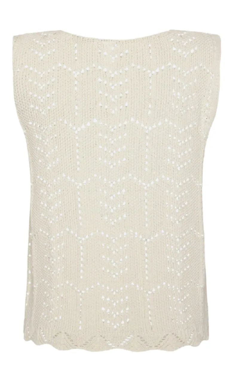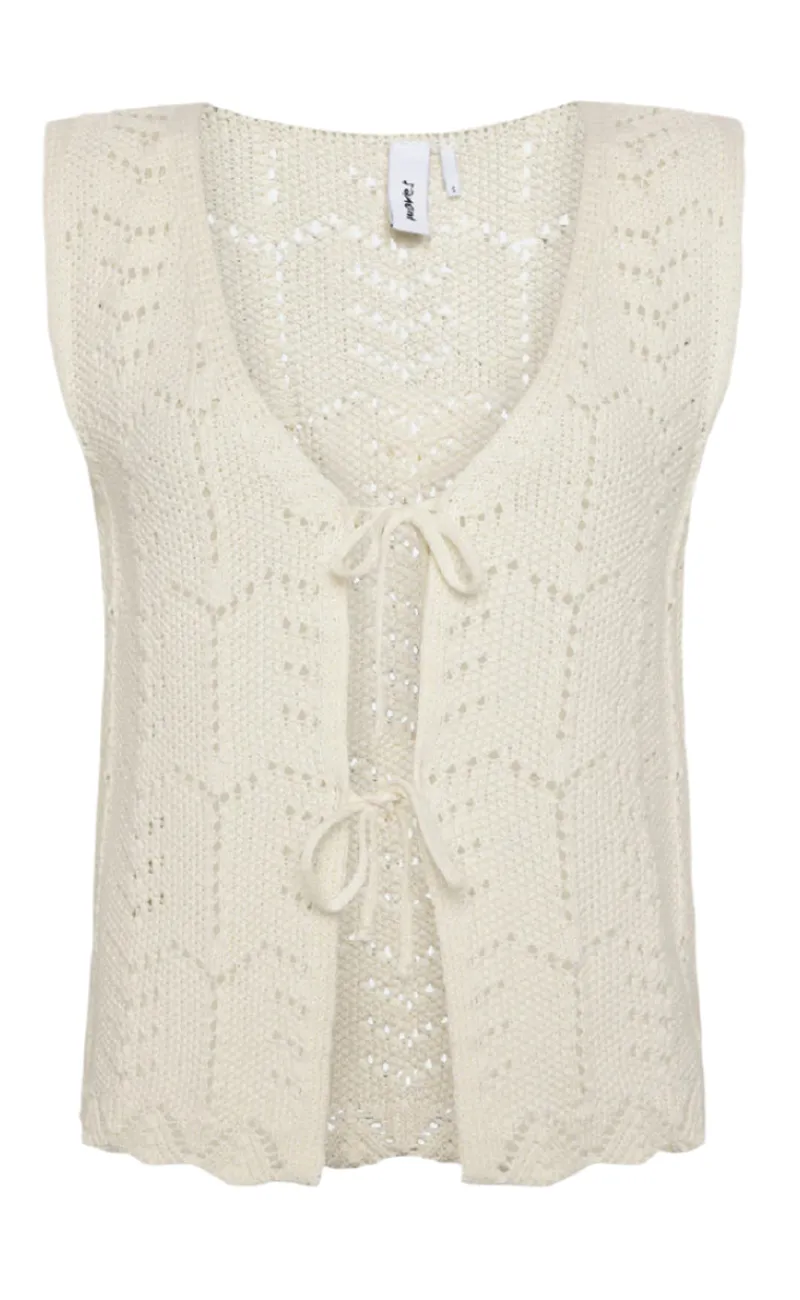 Strik vest fra Moves i en beige farve, som lukkes fortil med binedbånd.
