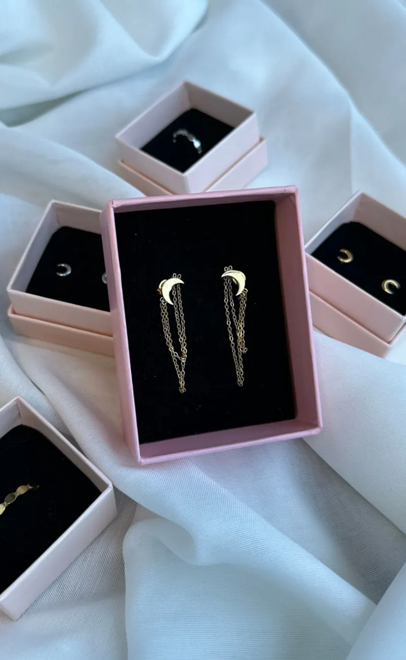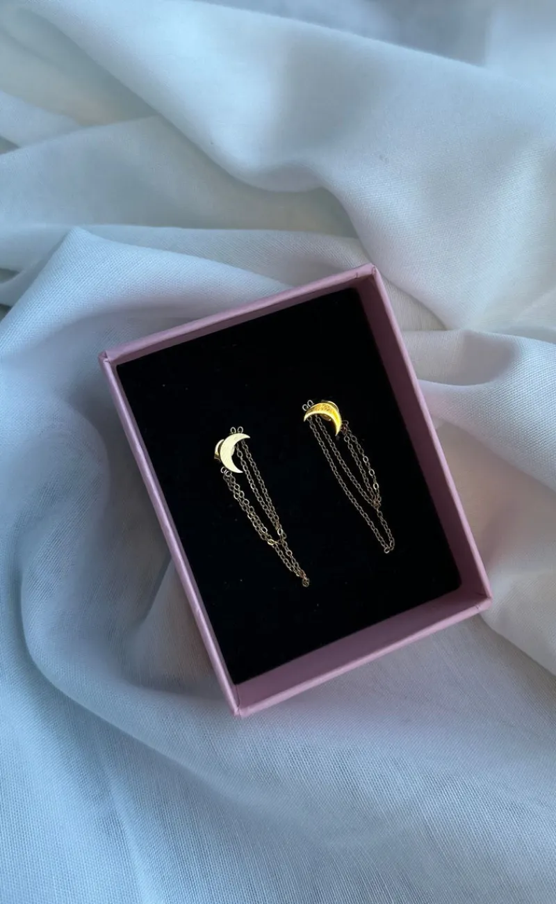 Populære øreringe fra Smykkeli Copenhagen i guld med form som en måne og to kæder ved låsen.