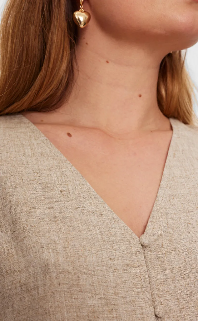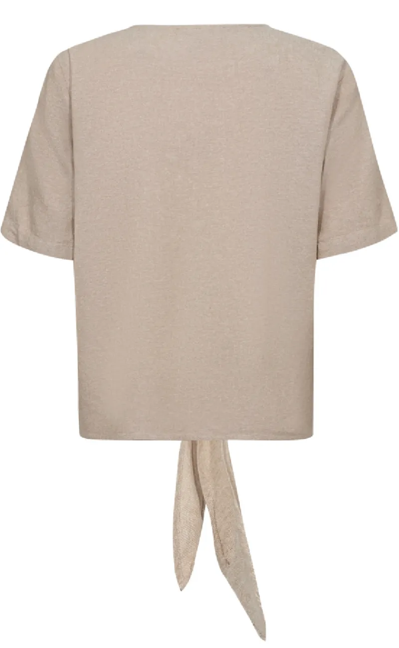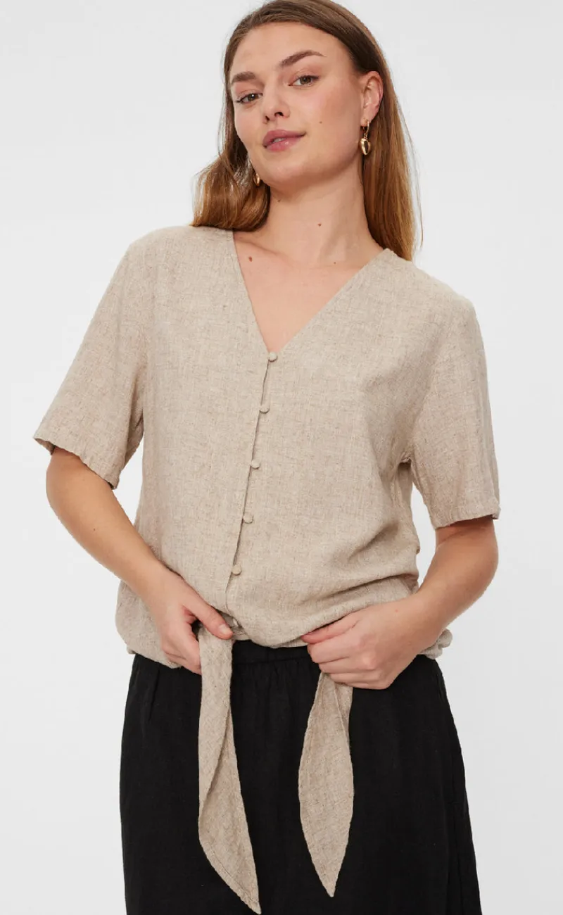 Flot hør bluse fra Freequent i beige, med en fin wrap detalje fortil.