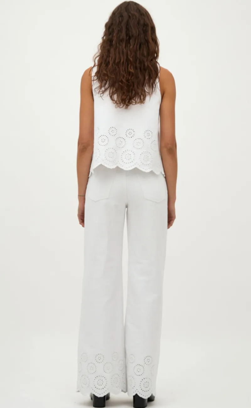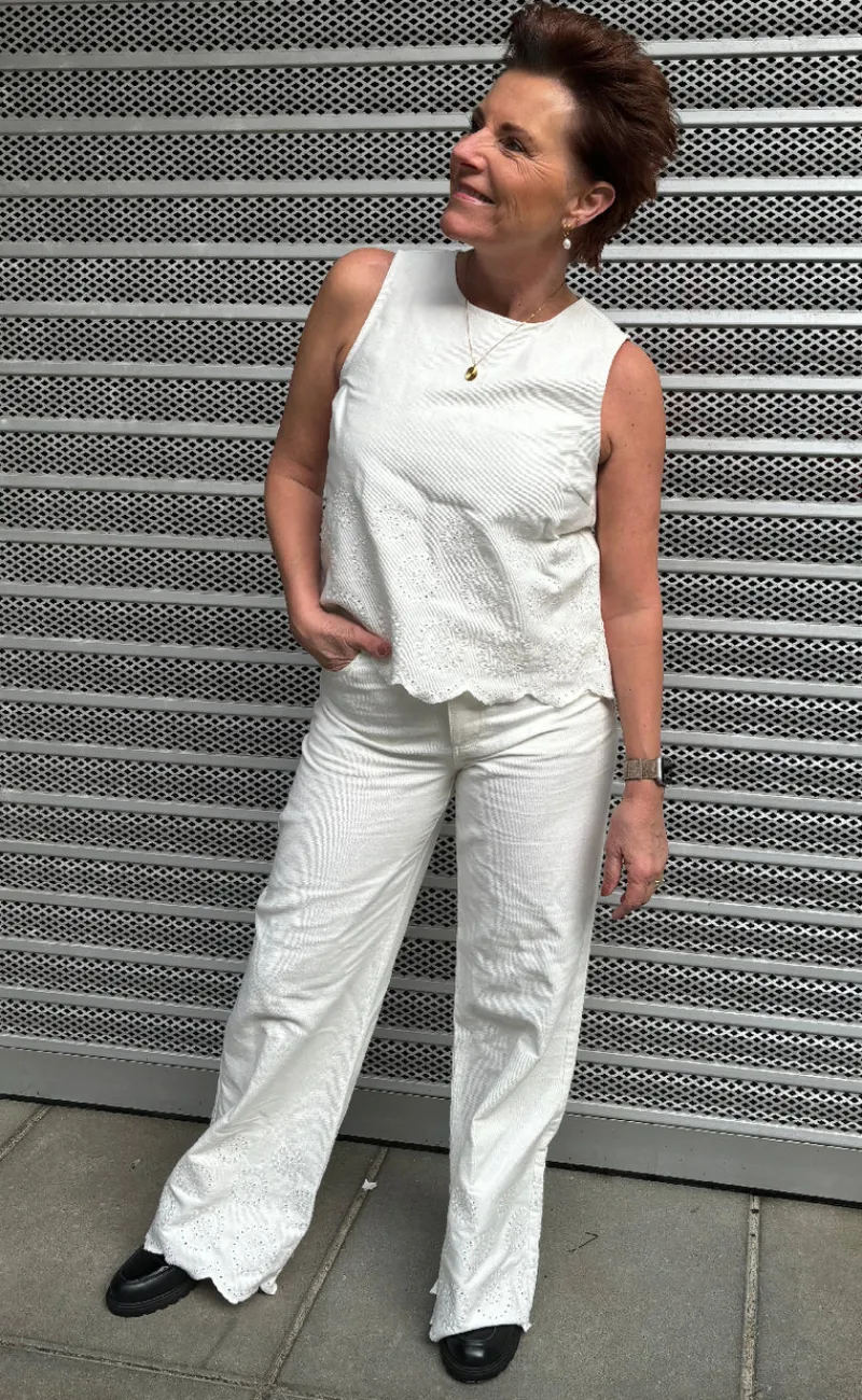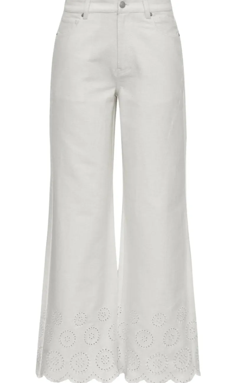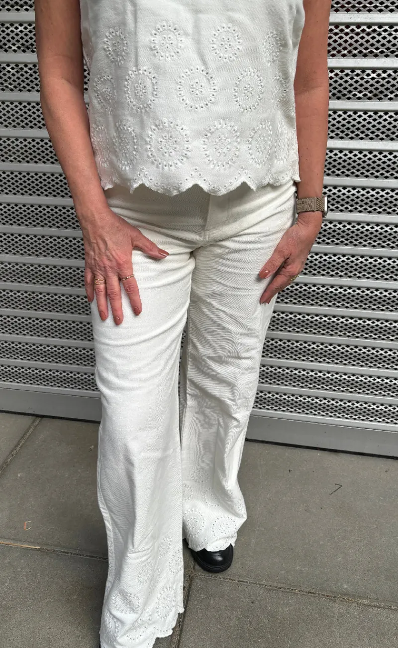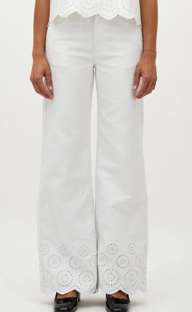 Bukserne har broderi detaljer og hvide bukseben.