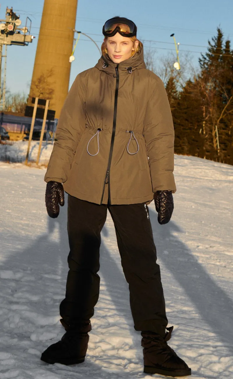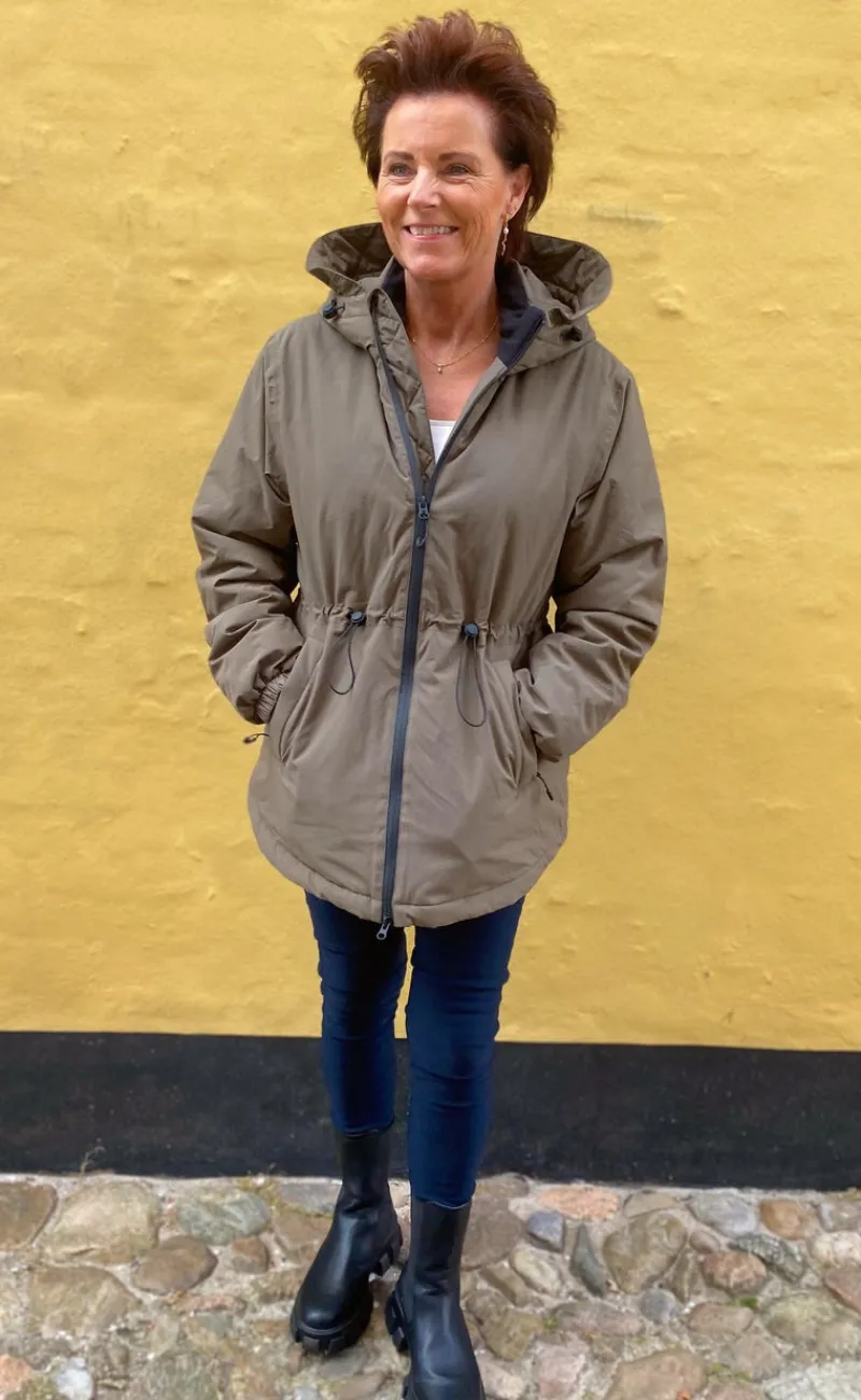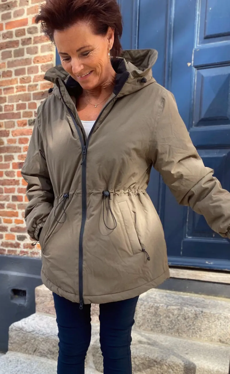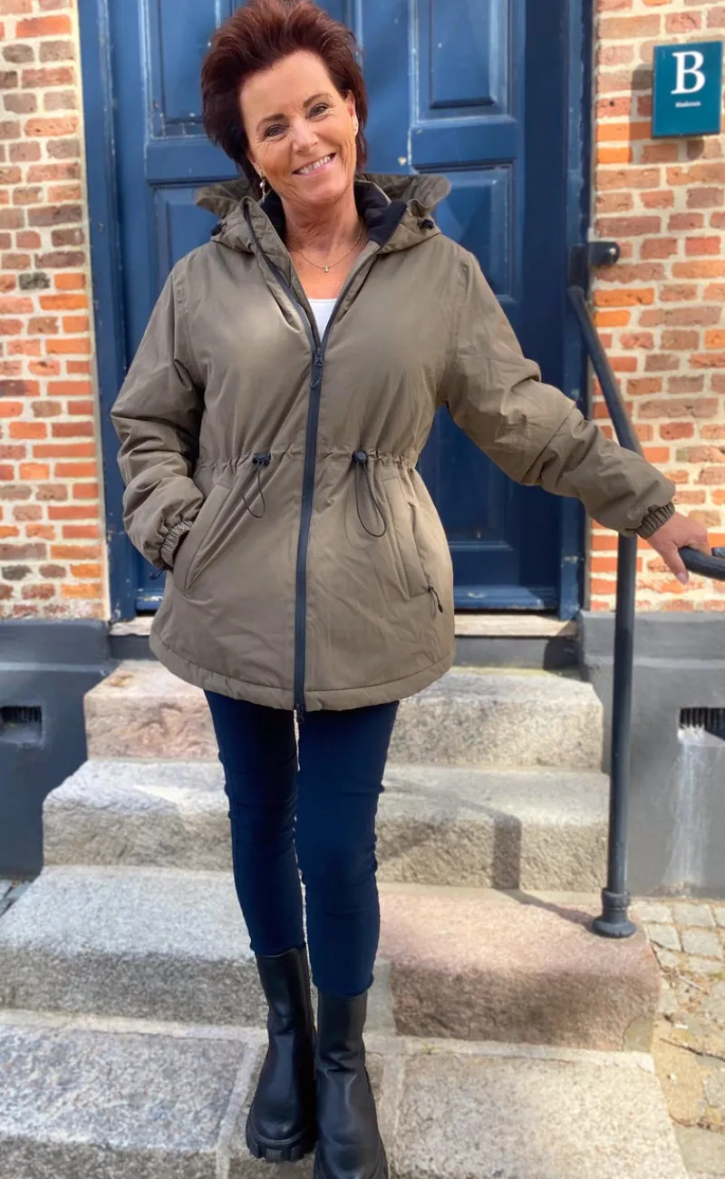 Jakken har snøre i taljen og er uundværlig til de kolde dage!