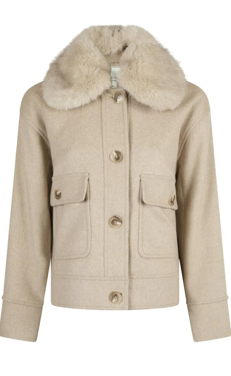 Denne uld jakke fra Neo Noir kommer i en sandfarve. Den har en mellem kort længde, pels-look krave og lykkes med knapper.
