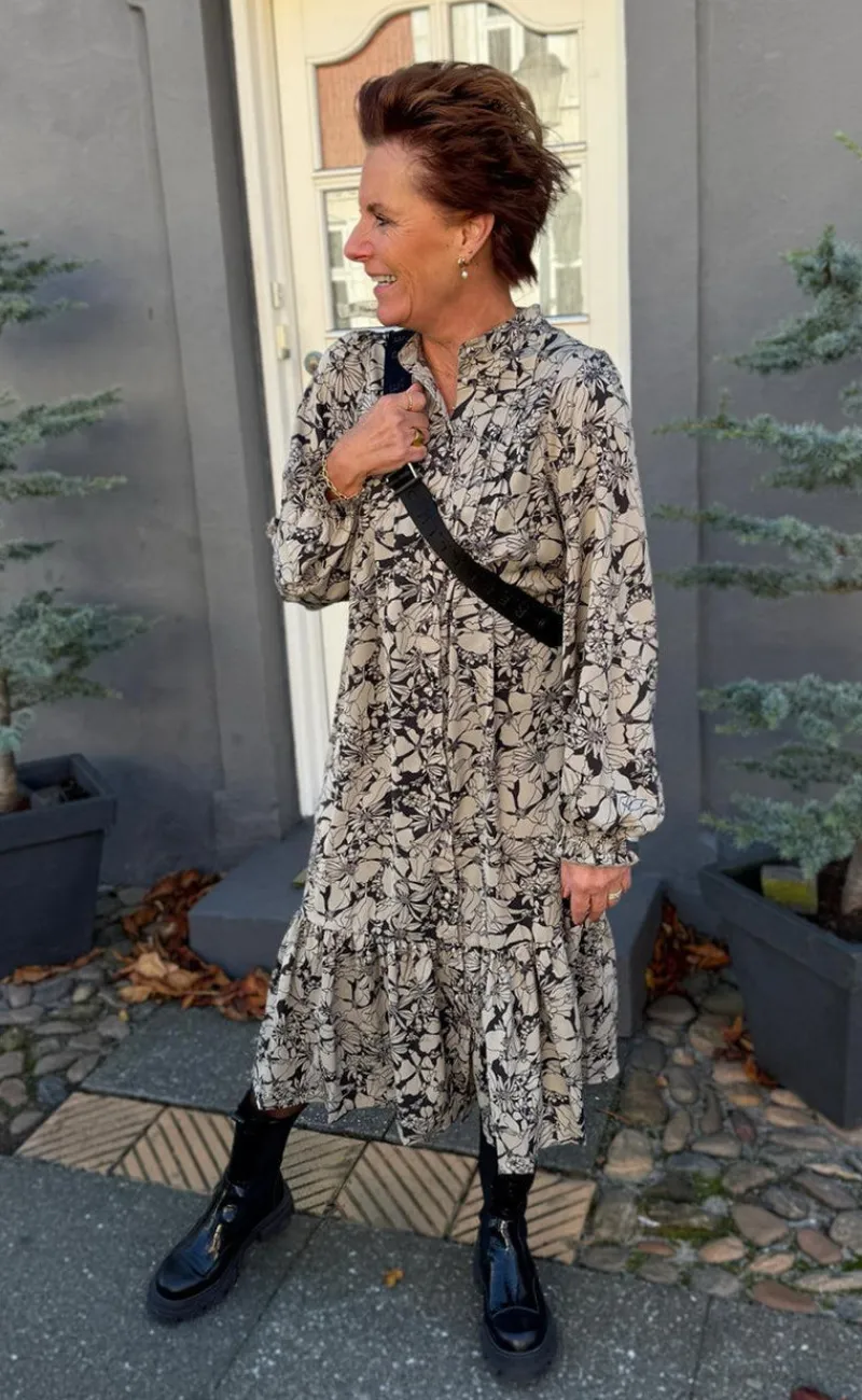 Fin kjole fra INA Copenhagen med blomster print i mørke nuancer.