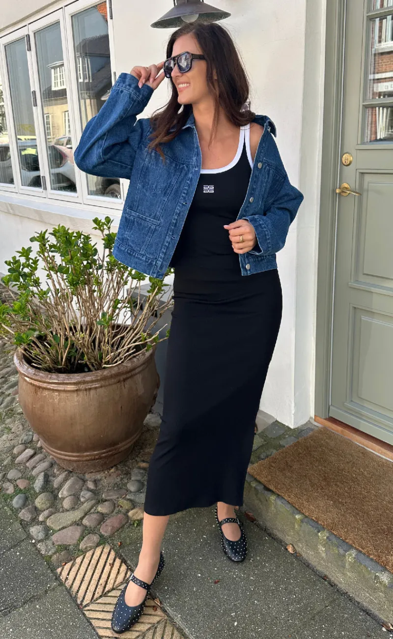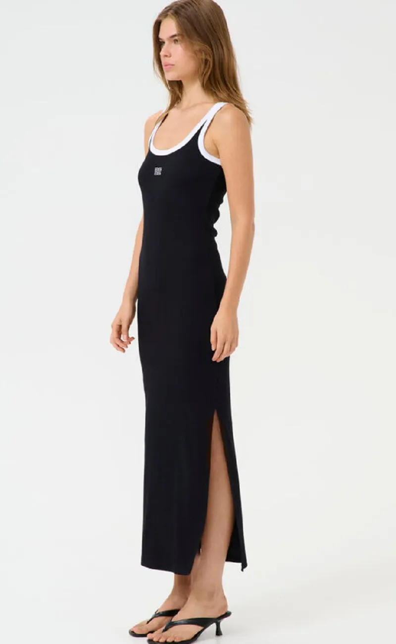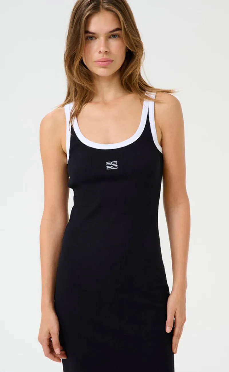 Tætsiddende maxi kjole fra Gestuz i sort med hvide kontrast sygninger, i en ribbet kvalitet.