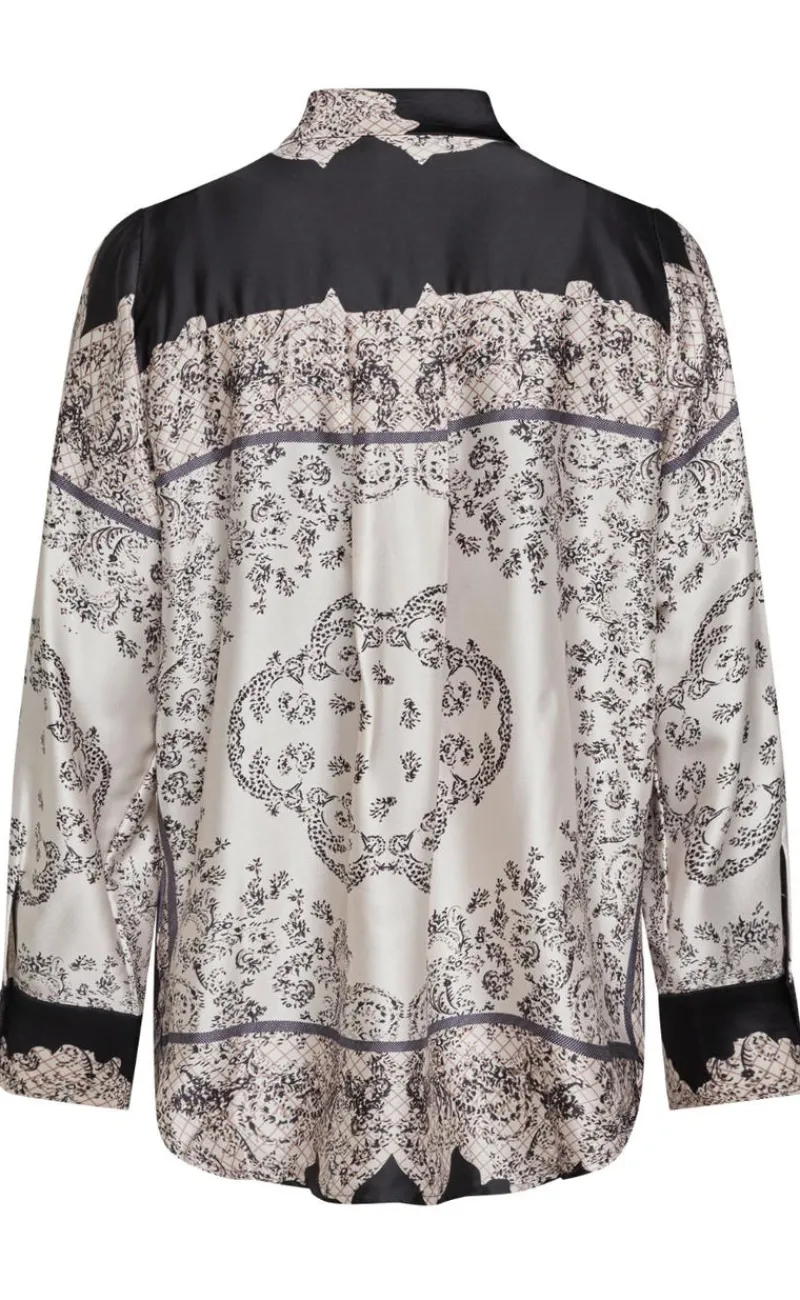 Denne bluse er i en beige og sort farve.