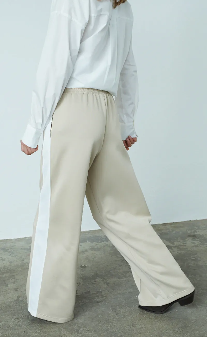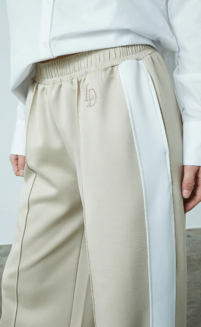 Flotte tracksuit bukser fra Love & Divine i beige, med en hvid stribe ned langs siden.