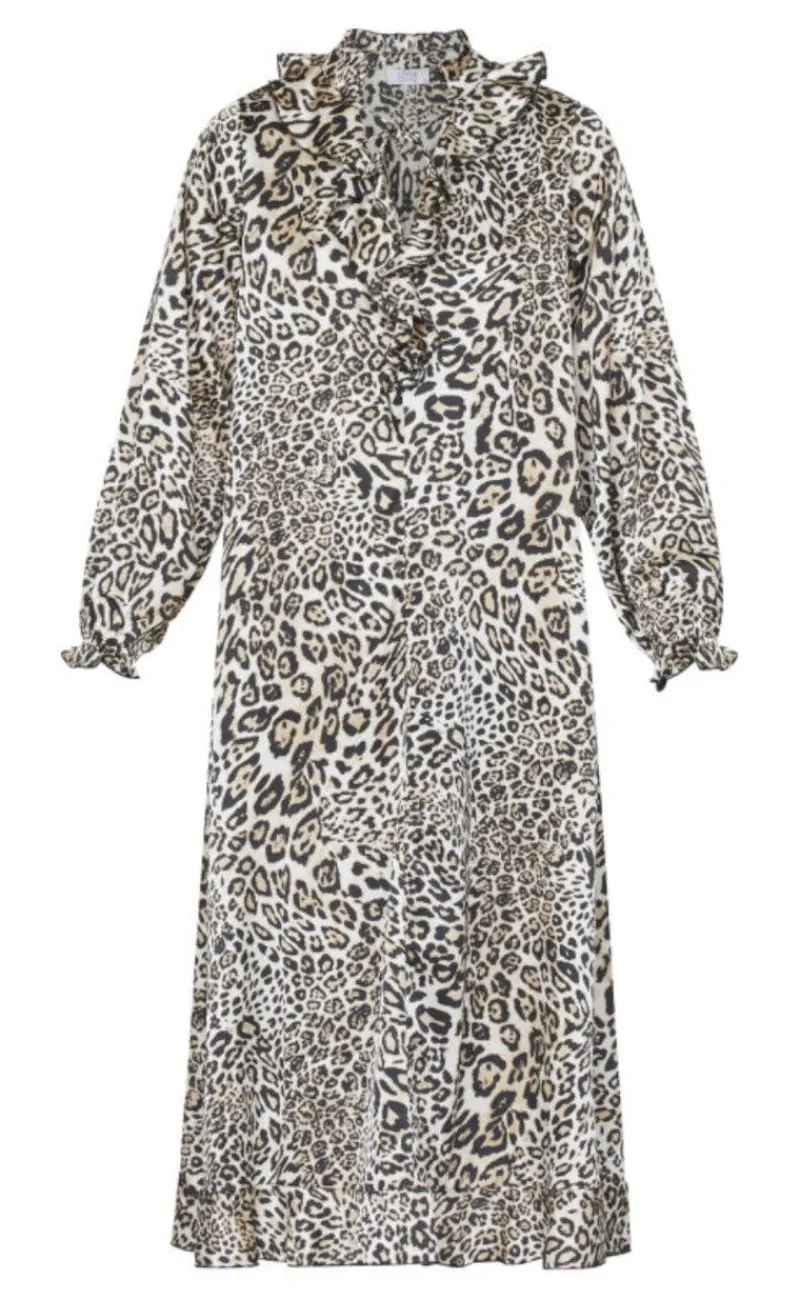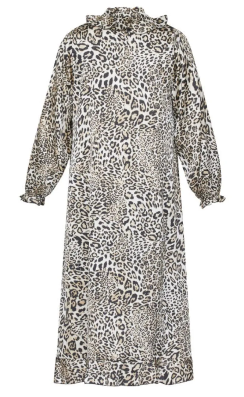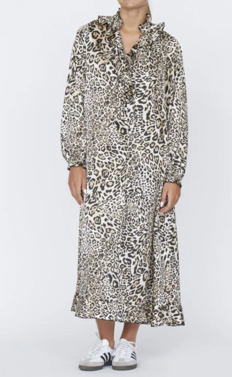 Denne smukke kjole fra Love&Divine, er en lang leopardprintet kjole med feminine flæser.
